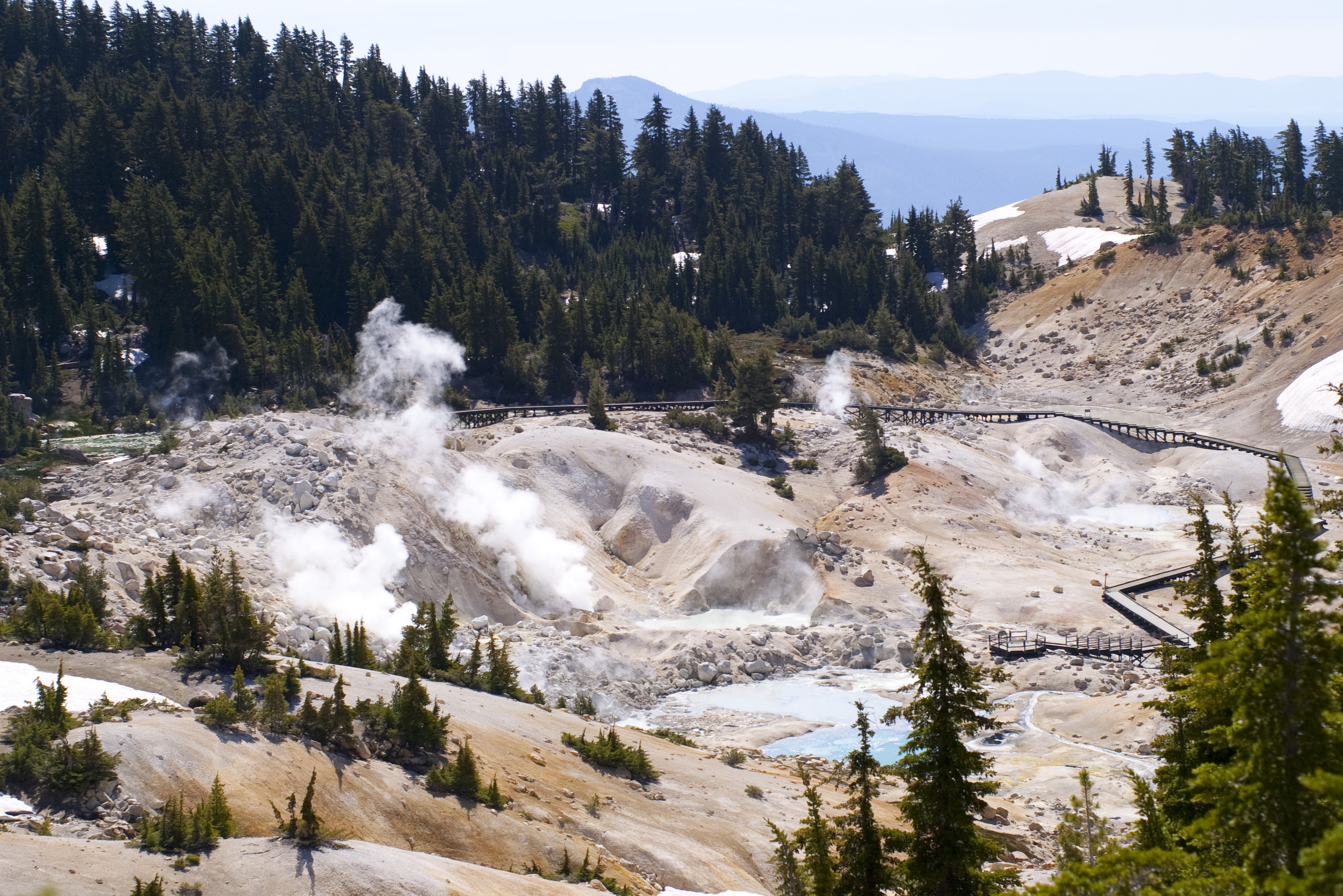 network fo walkways allows visitors to safely view the hot springs, fumeroles and mud pots in the Lassen Volcanic National Park