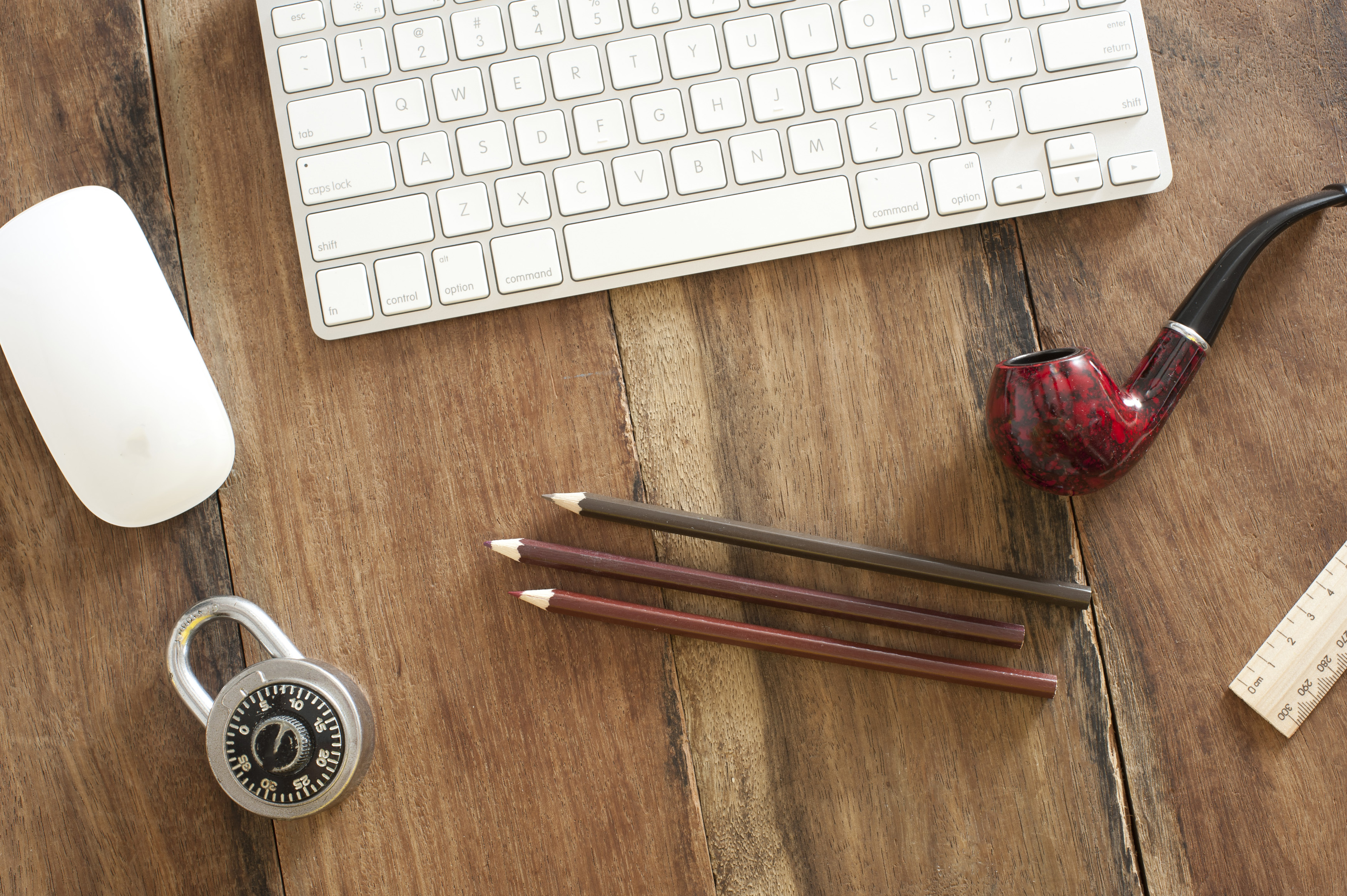 Keywords: above, business, desk, high angle view, keyboard, lock, mouse, pencils, pipe, still life, student, ruler, copy space, scattered, wooden
