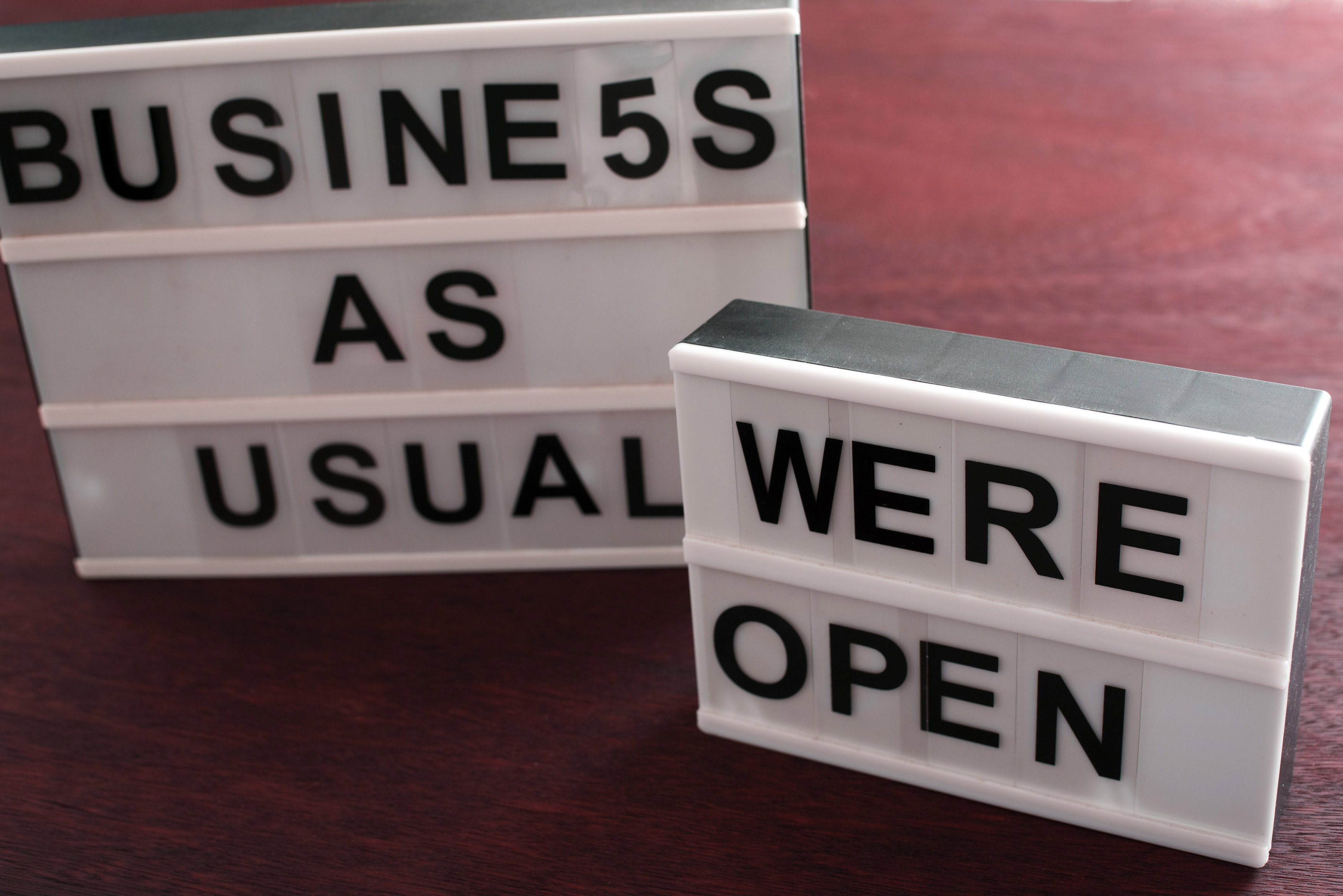 Two signs outside a business or store stating Business As Usual and Were Open viewed high angle