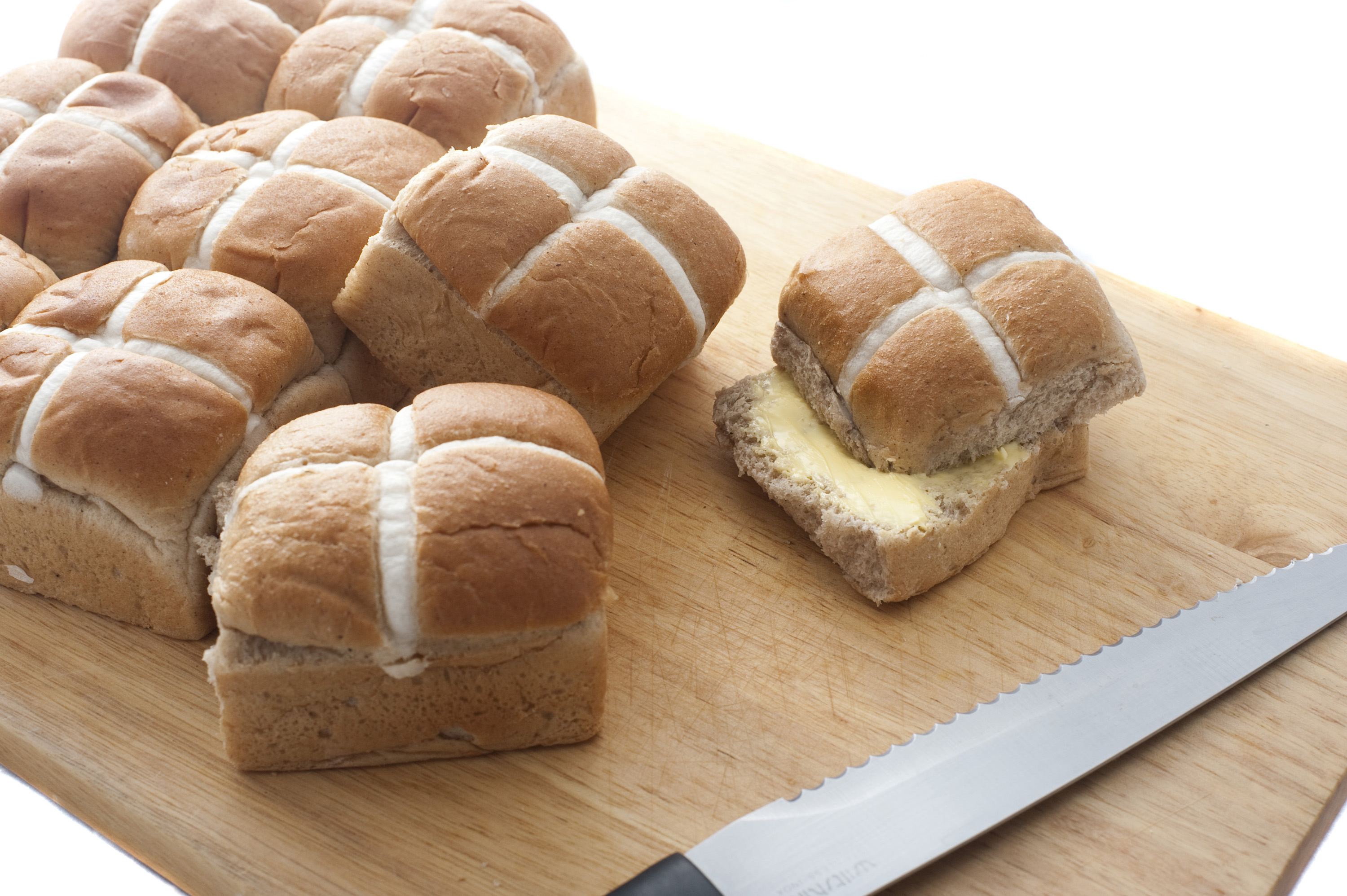 Buttered Fresh Hot Cross Buns on a wooden board to celebrate Easter