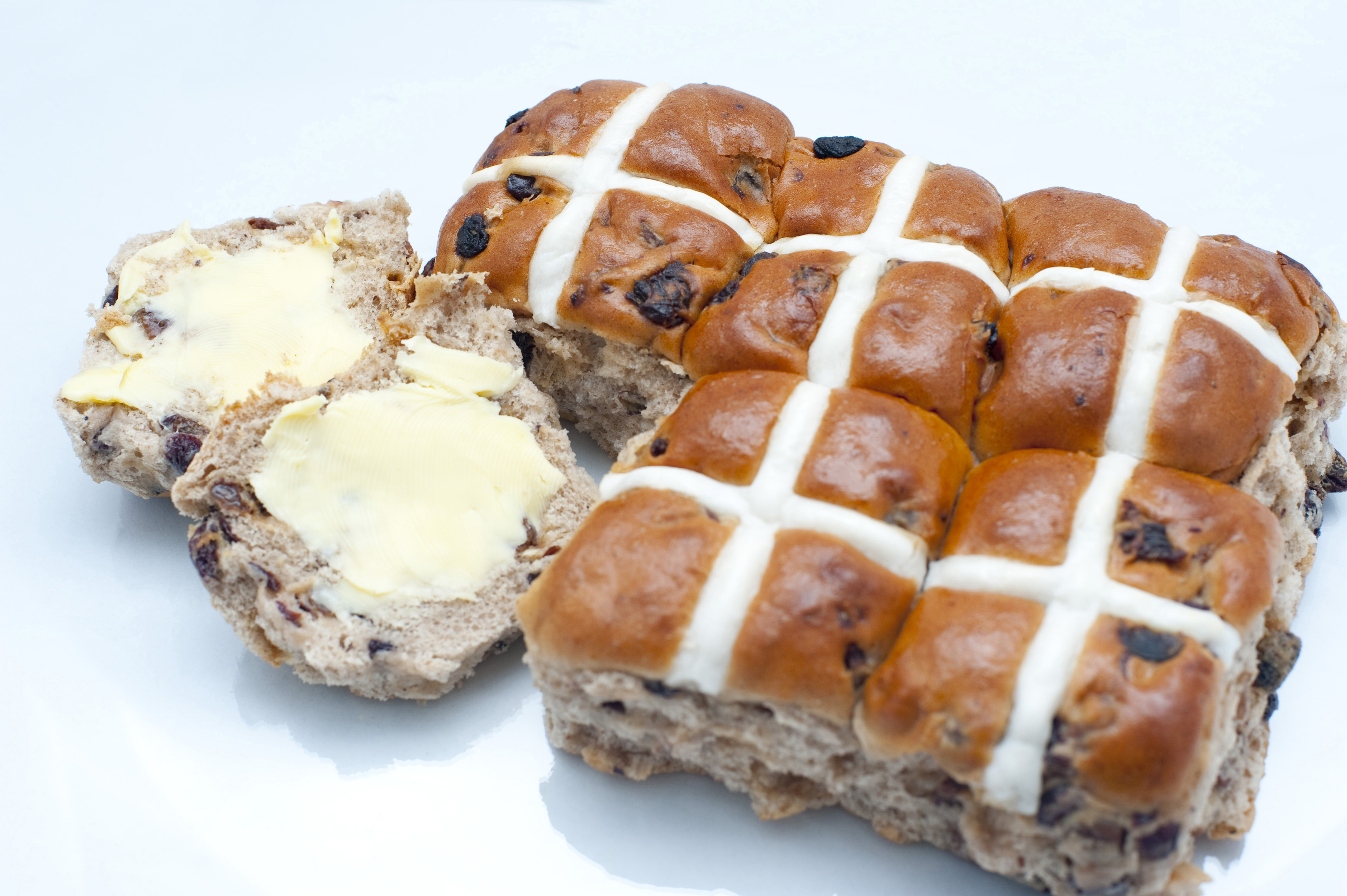 Keywords: food, fresh, fruity, sweet, symbolic, bun, raisins, cross, easter, baked, spicy, glazed, buttered, batch, hot cross bun