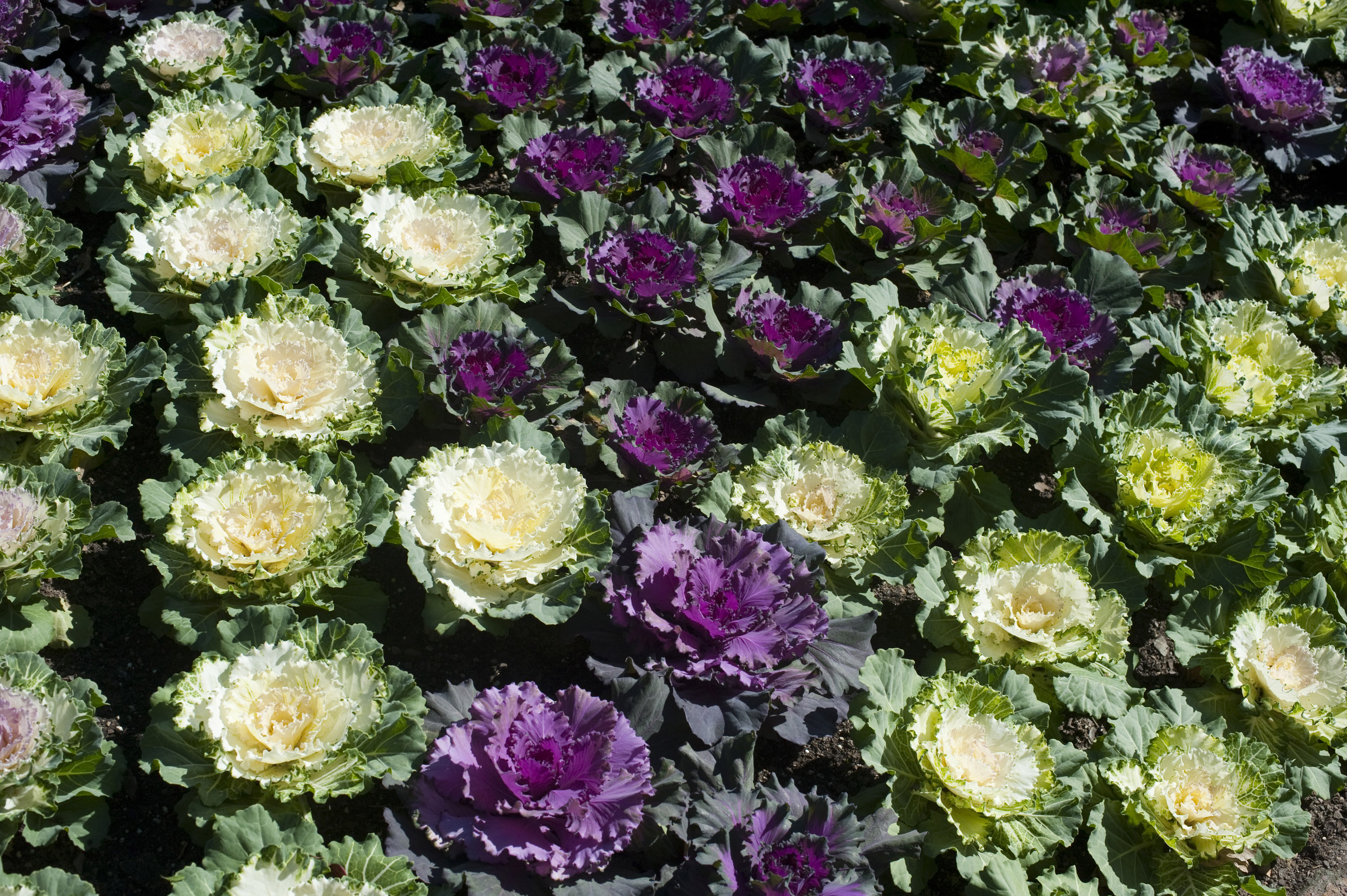 Flowering cabbages, or Brassica oleracea, an edible cabbage bred for its ornamental showy leaves which are often referred to as flowers