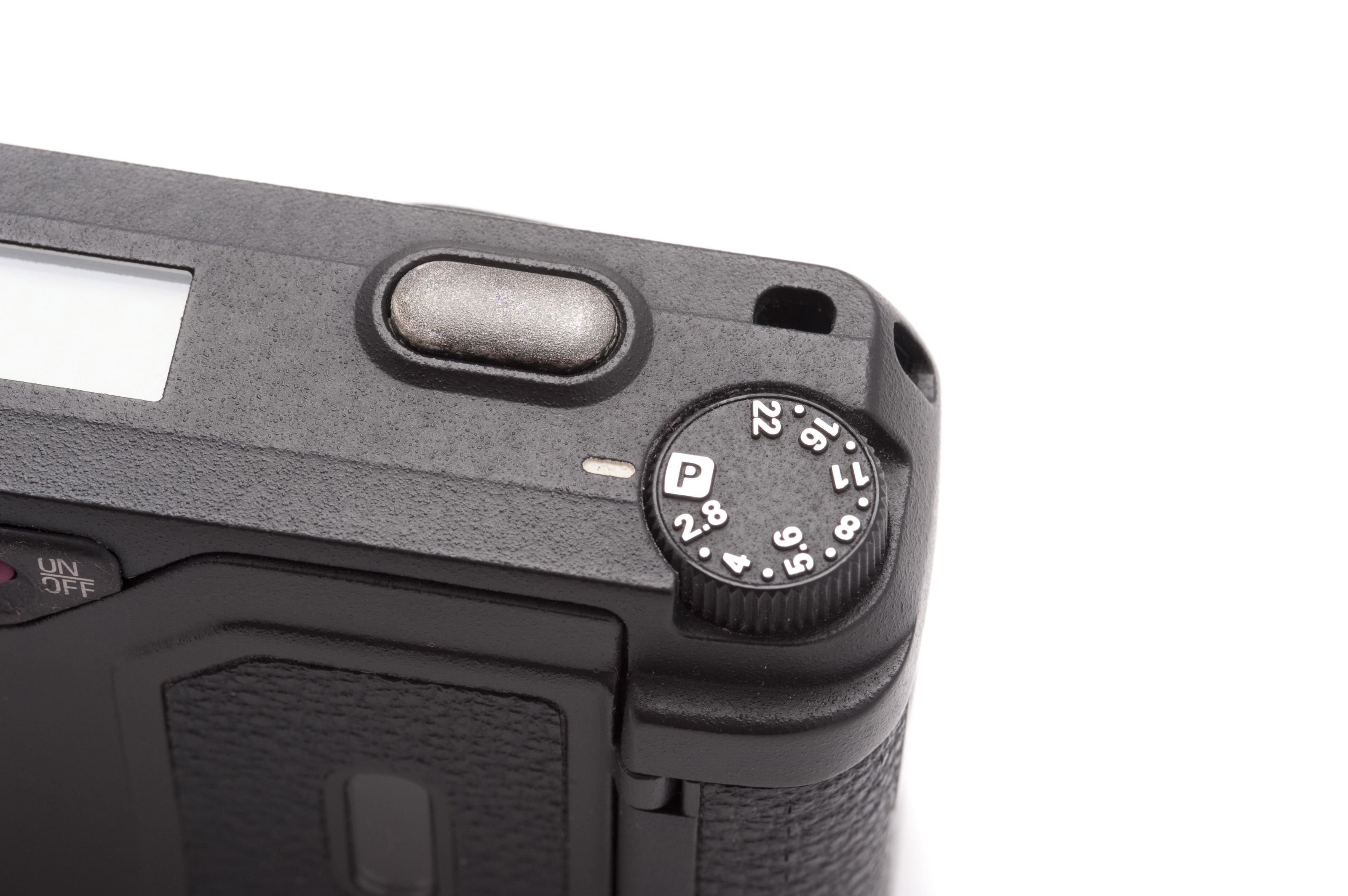 Close up top down view of f-stop dial on point-and-shoot pocket film camera over white background