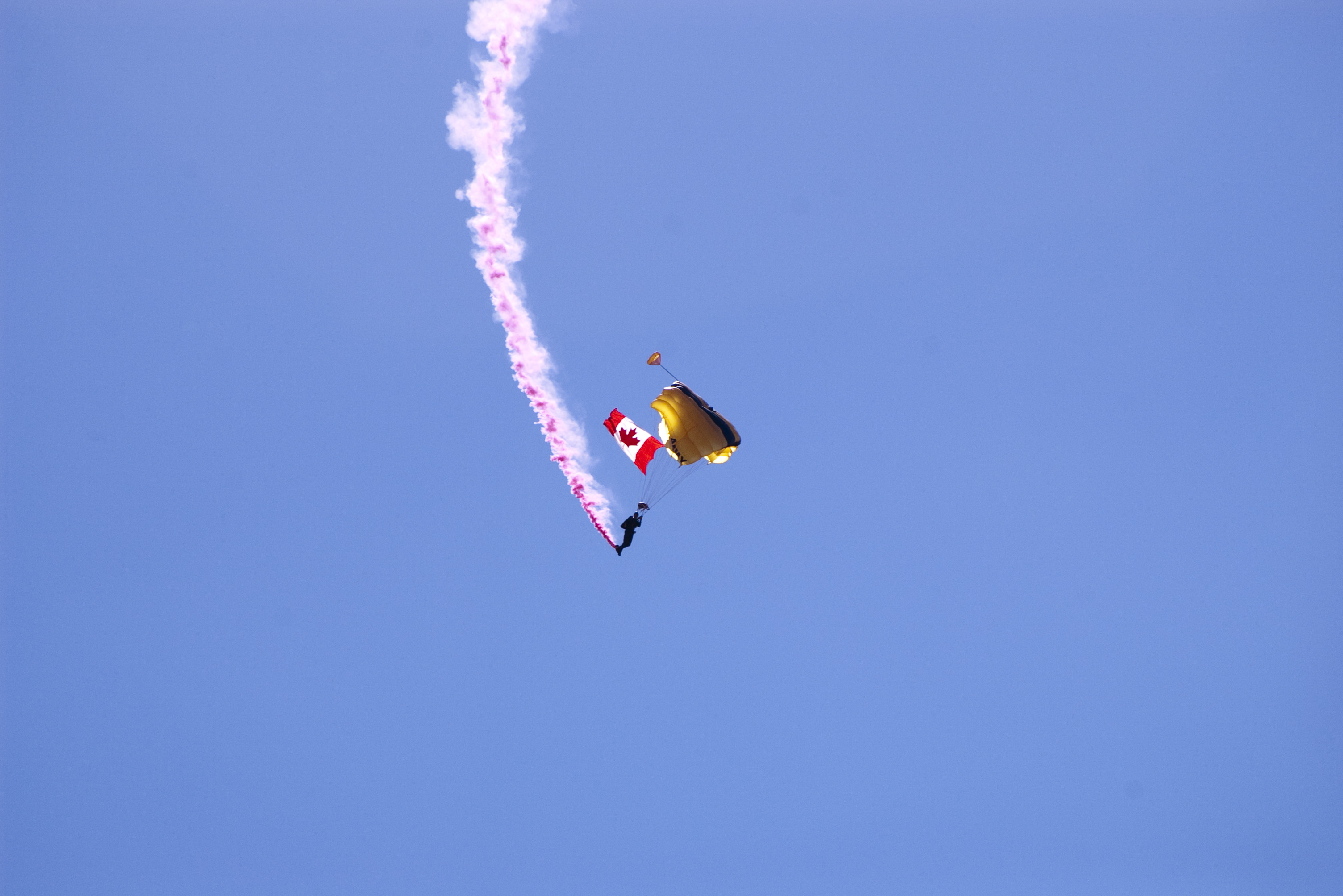 a paratrooper with a canadian flag at an air show