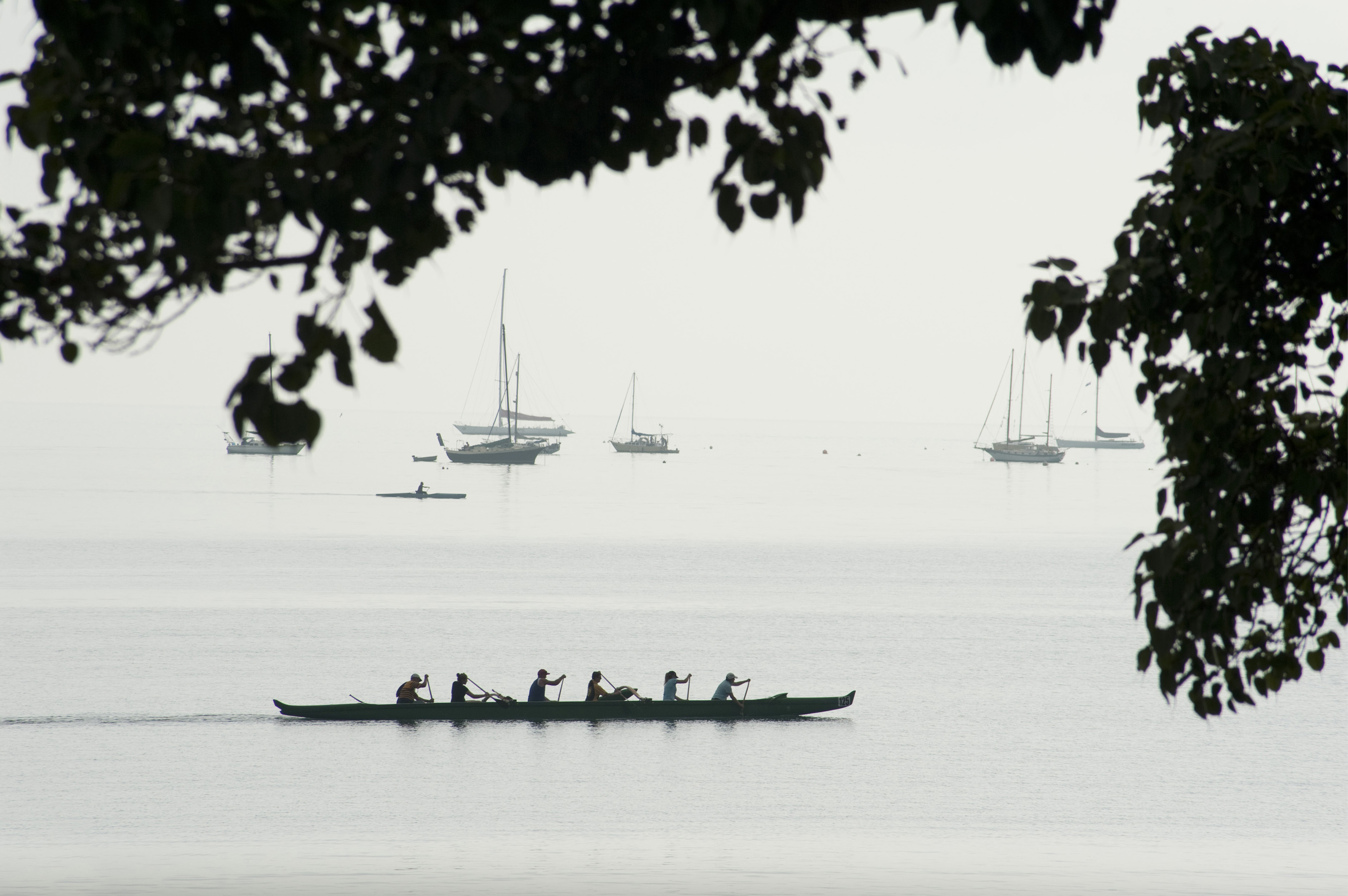 Silhouette Profile of Six Person Canoeing Team Paddling in Long Canoe Along Shoreline of Lake with Sailboats in Background