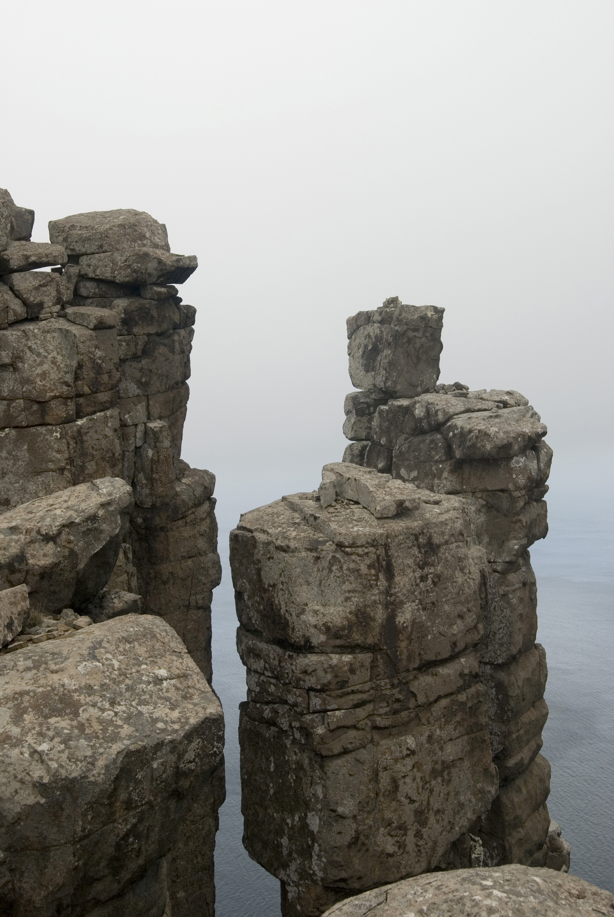 free standing rock formations perched high on the cliffs of cape pillar, tasmania
