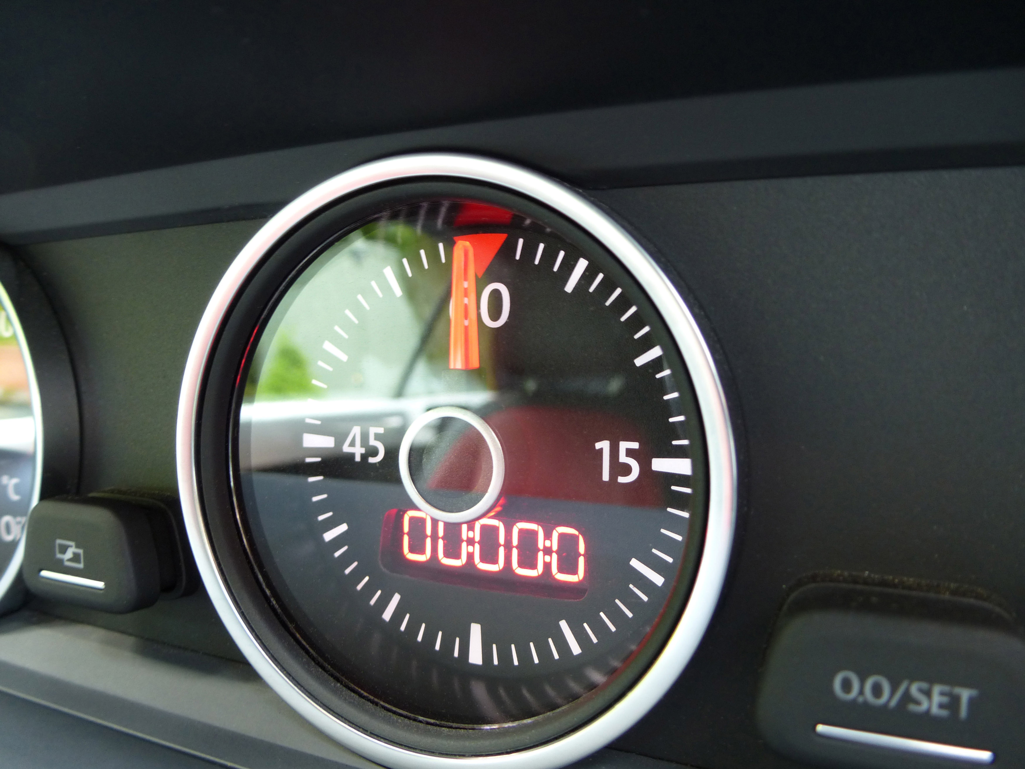 Lap timer on the black dashboard of a modern car with a round dial showing zero on the digital readout