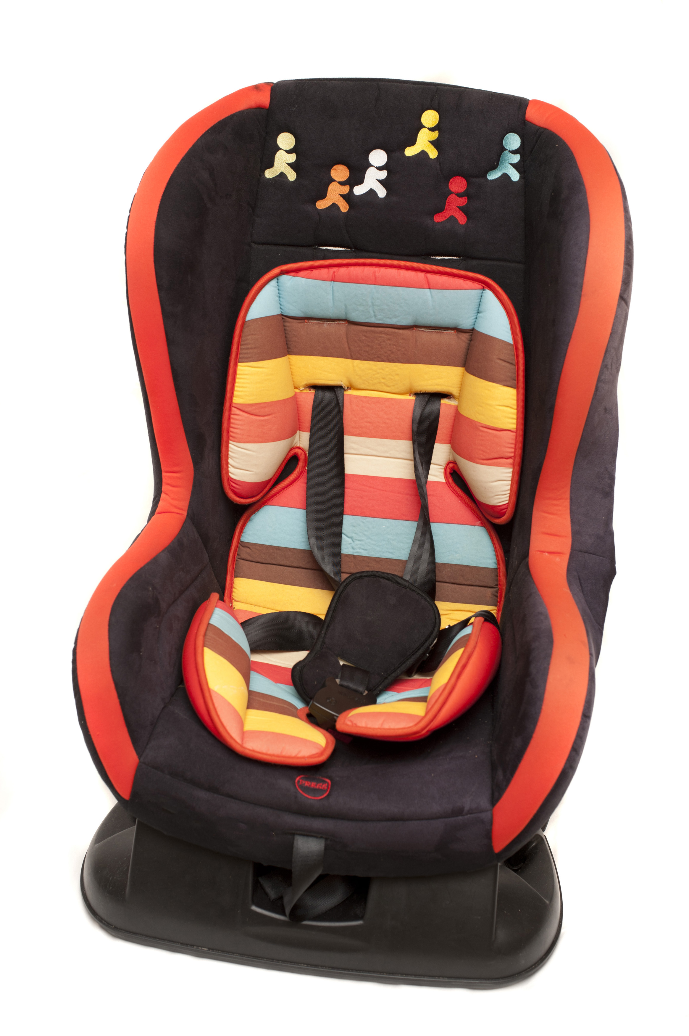 Colorful baby safety car seat for a young child decorated with striped fabric and little running figures isolated on white
