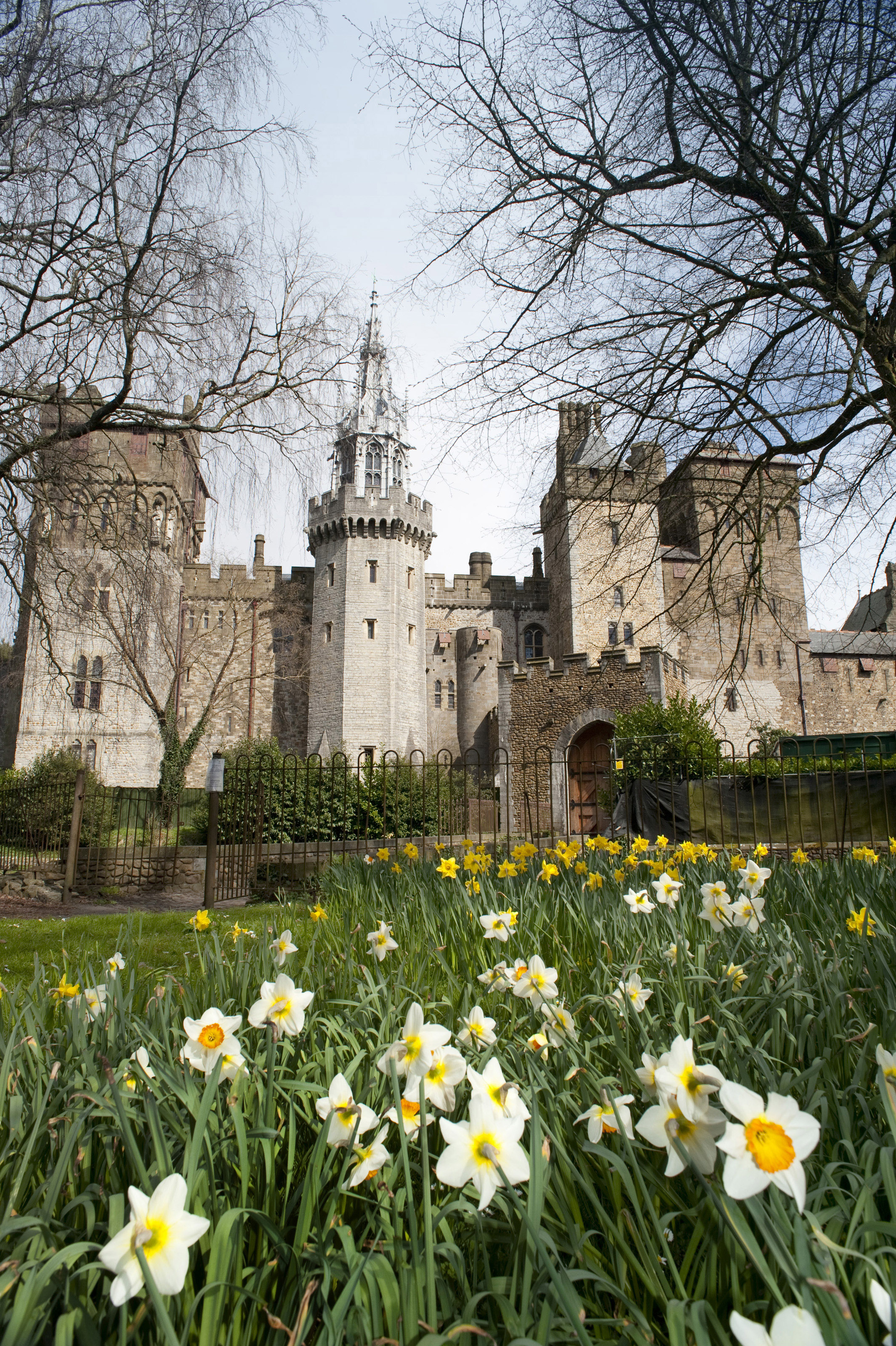 Keywords: cardiff castle, barbican, bute park, building, old, scenery, scenic, tower, historical, landmark, medieval, flowers, blooming, wales, daffodils, welsh, nature, spring, gardens, battlements