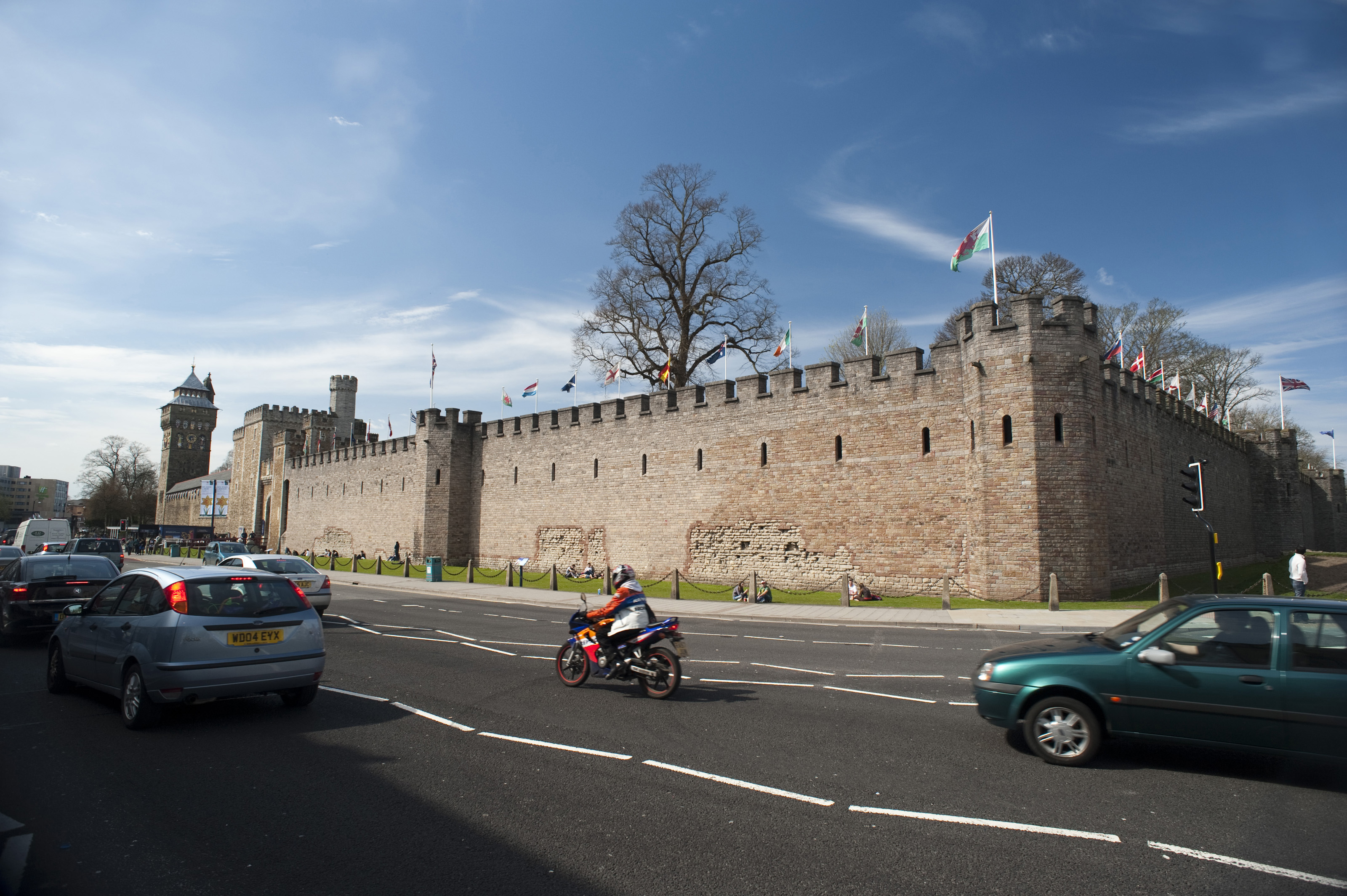 View from the street with traffic in the foreground of the perimeter walls of Cardiff Castle in Cardiff, Wales