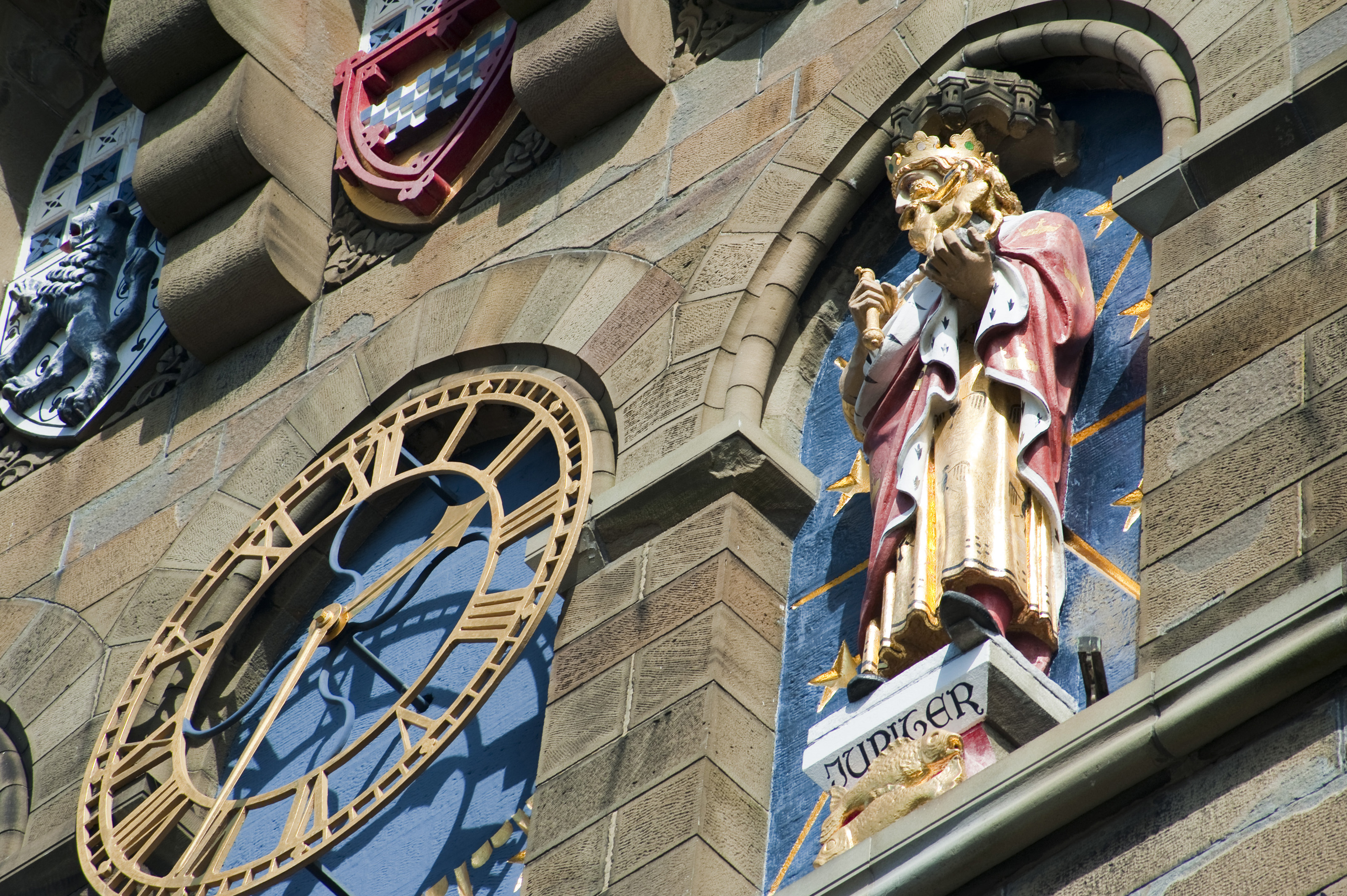 Keywords: william burges, cardiff castle, clock tower, edward dent, metal, travel, clock, exterior, historical, planets, gilded, wales, cardiff, statue, sculpture, shield, heraldic, stone, architecture, landmark