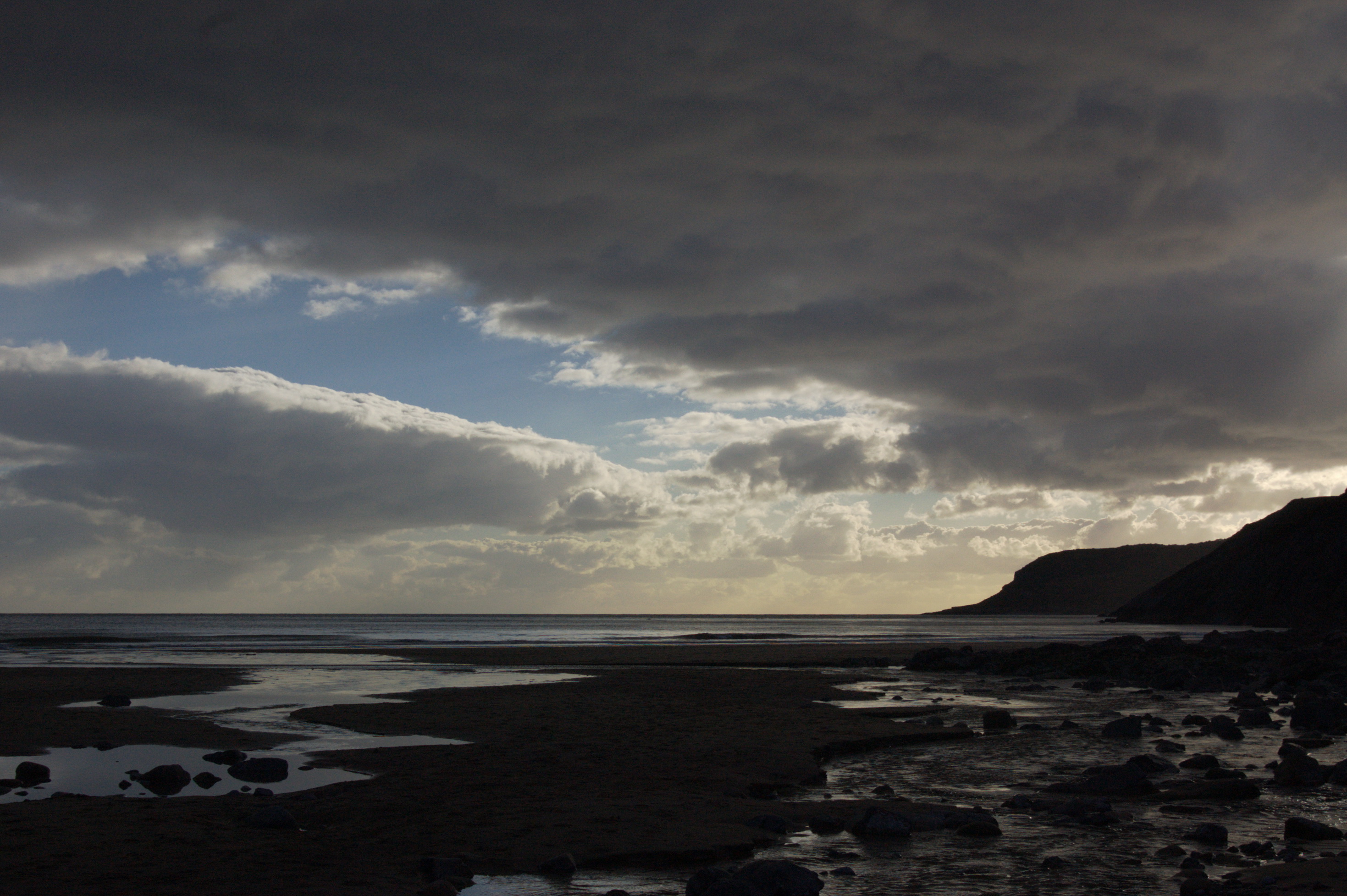 Caswell Bay, in South Wales close to dusk. Shows a coastal stream and the Gower coastline in silhouette