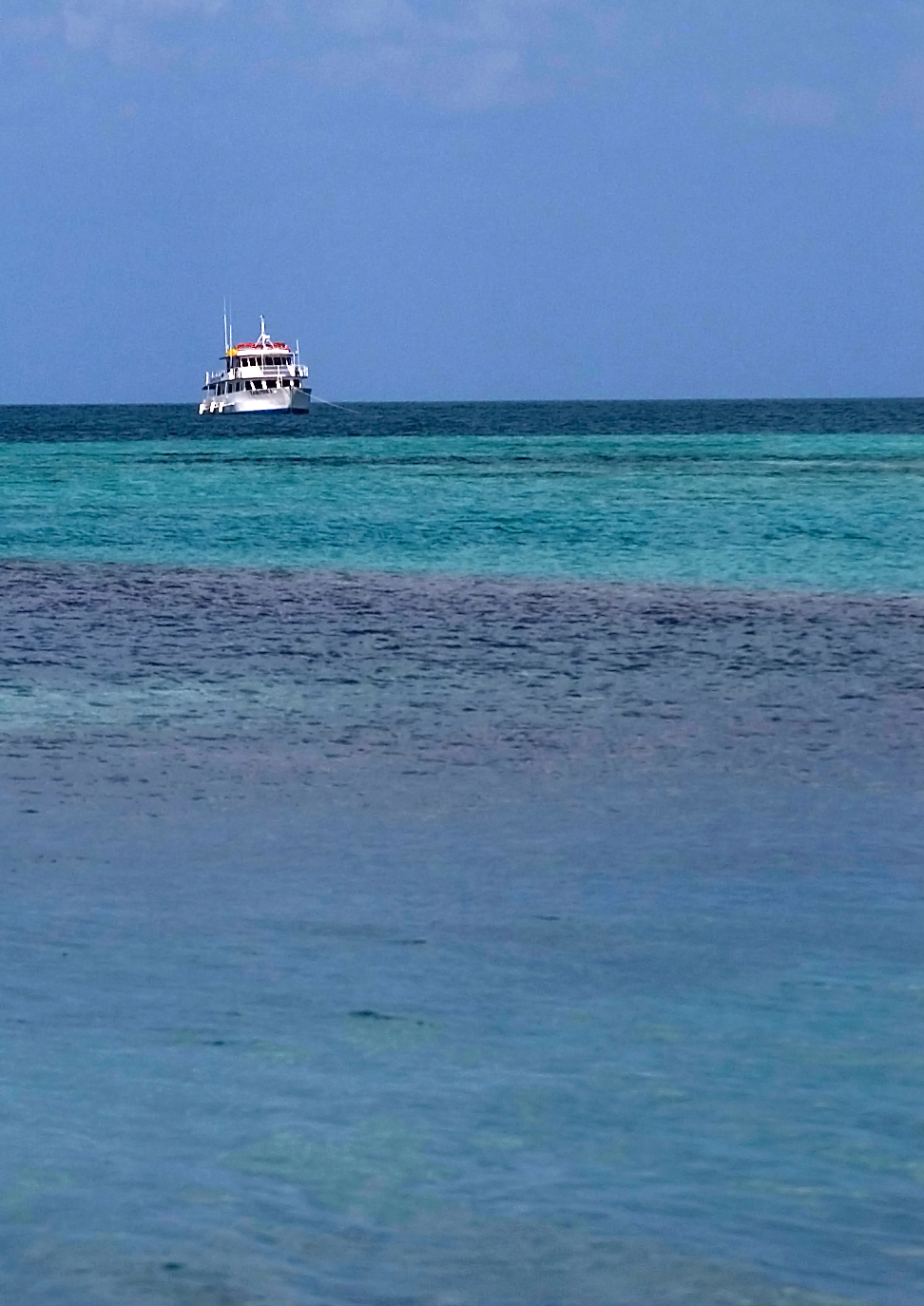 Keywords: belize, tropical, central america, boat. blue, water, ocean, aquamarine. flat, calm, still, ripples, anchor, anchored