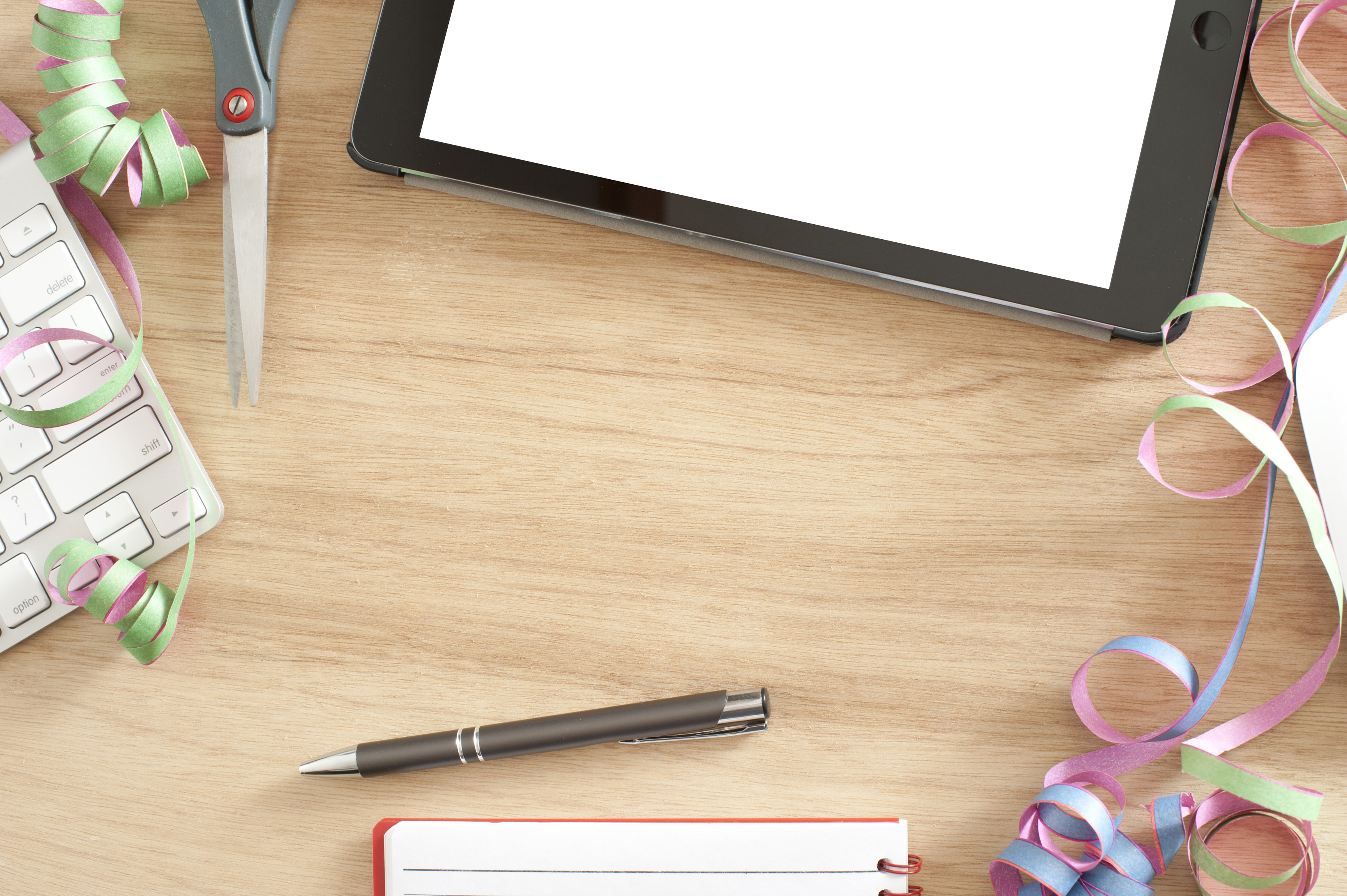 Keywords: business, celebration, computer, desk, festive, keyboard, party, streamers, tablet, pen