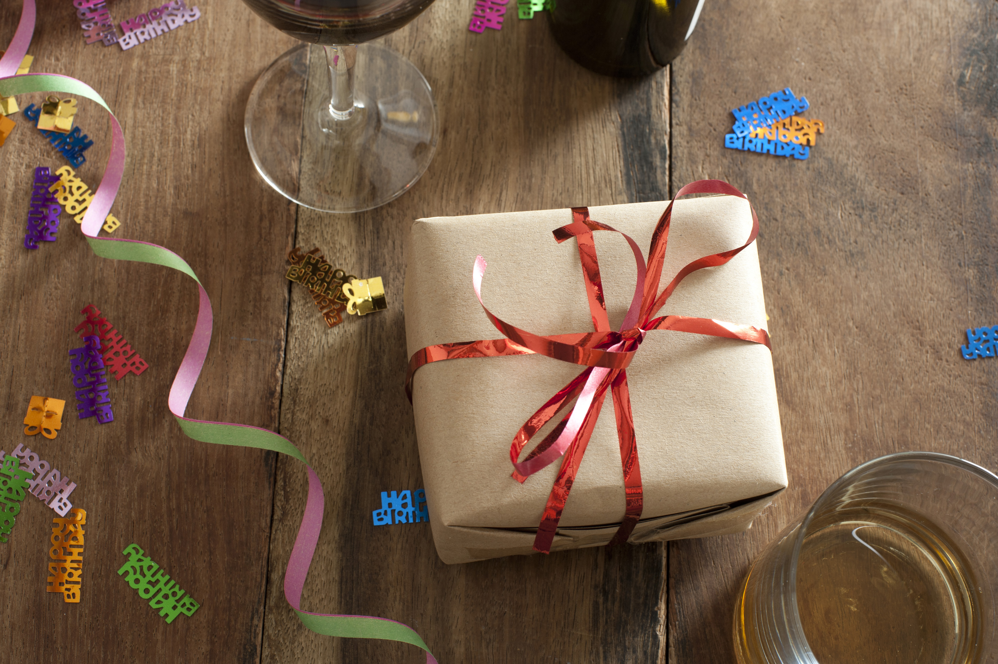 Keywords: birthday, bottle, celebration, confetti, drink, enjoyment, fun, gift, glass, party, present, scattered, streamers, wine, wrapped, alcohol