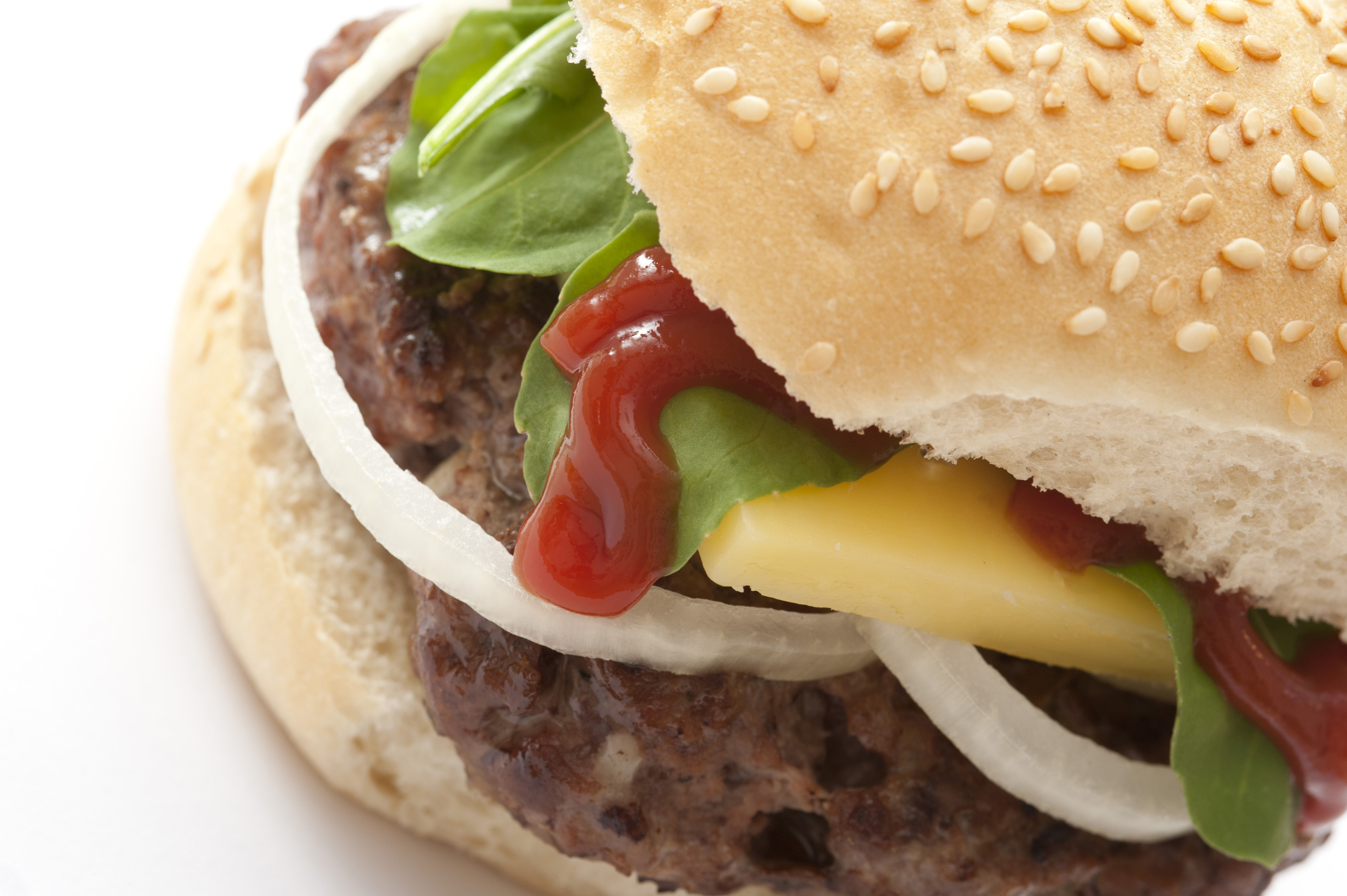 Keywords: beef, bun, burger, cheeseburger, closeup, fast, food, grilled, hamburger, ketchup, meal, meat, sandwich, sesame, tasty, macro, closeup, on white