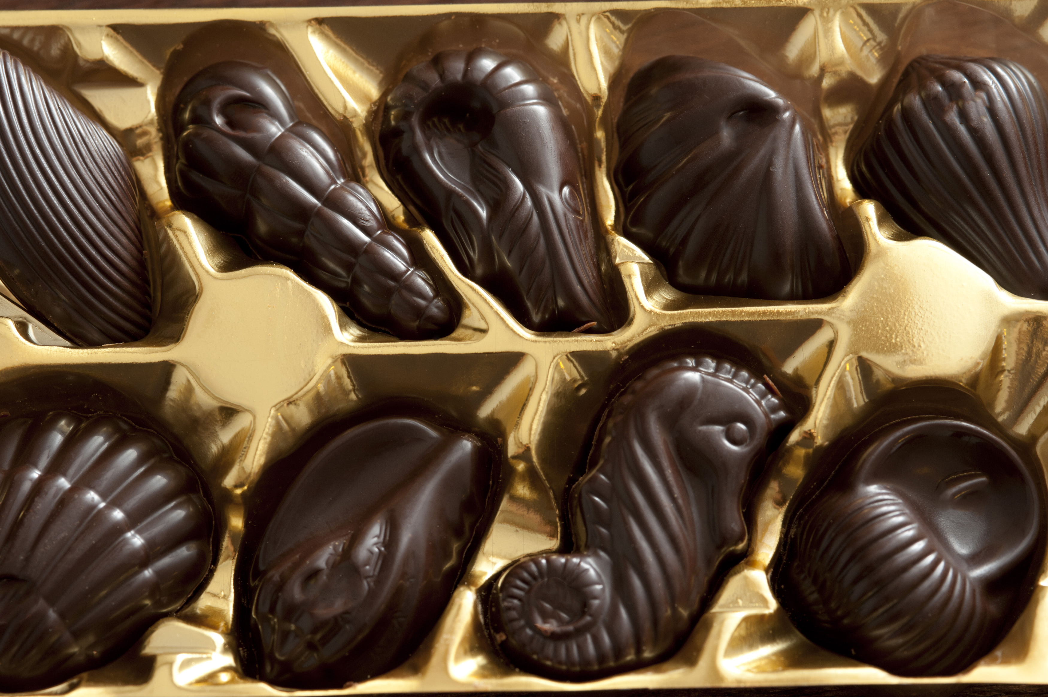 Assortment of dark marine shell shaped chocolates with a sea horse in their original packaging in a close up overhead view