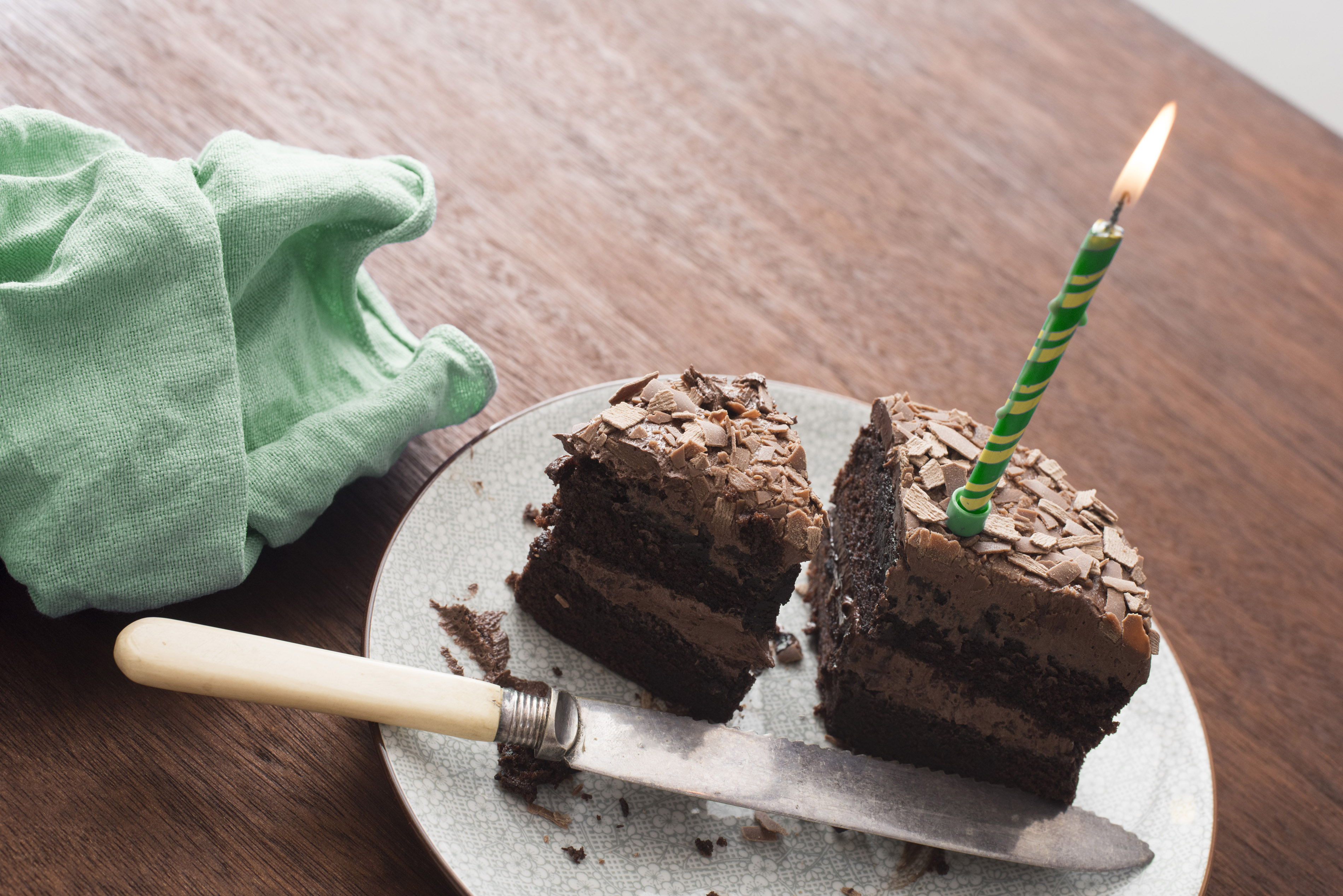 Remnants of a chocolate birthday cake with green candle on a plate with a knife viewed high angle on a table