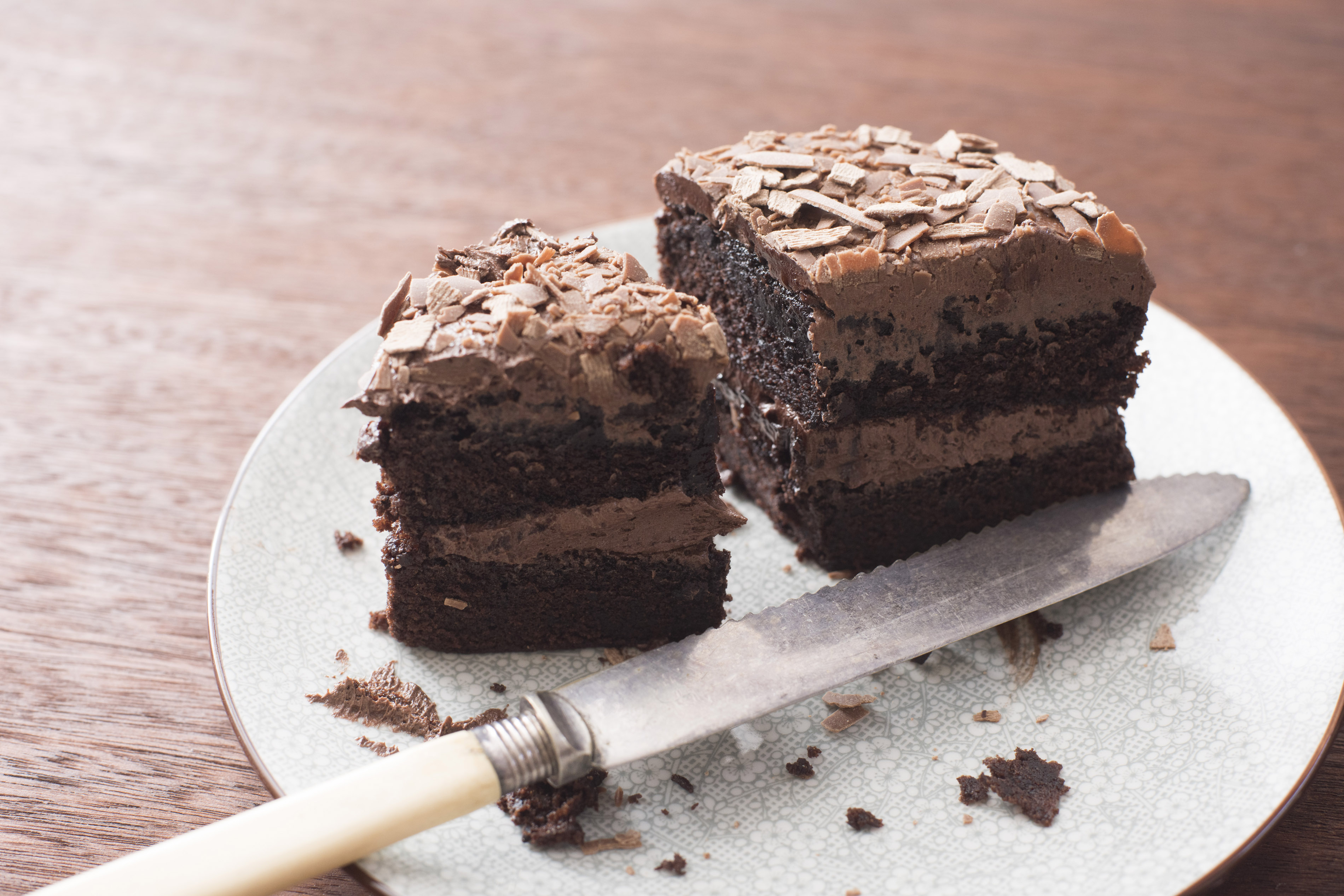 Keywords: baking, cake, crumbs, cut, dessert, fresh, icing, knife, plate, slices, sponge, sweet, chocolate, teatime, food