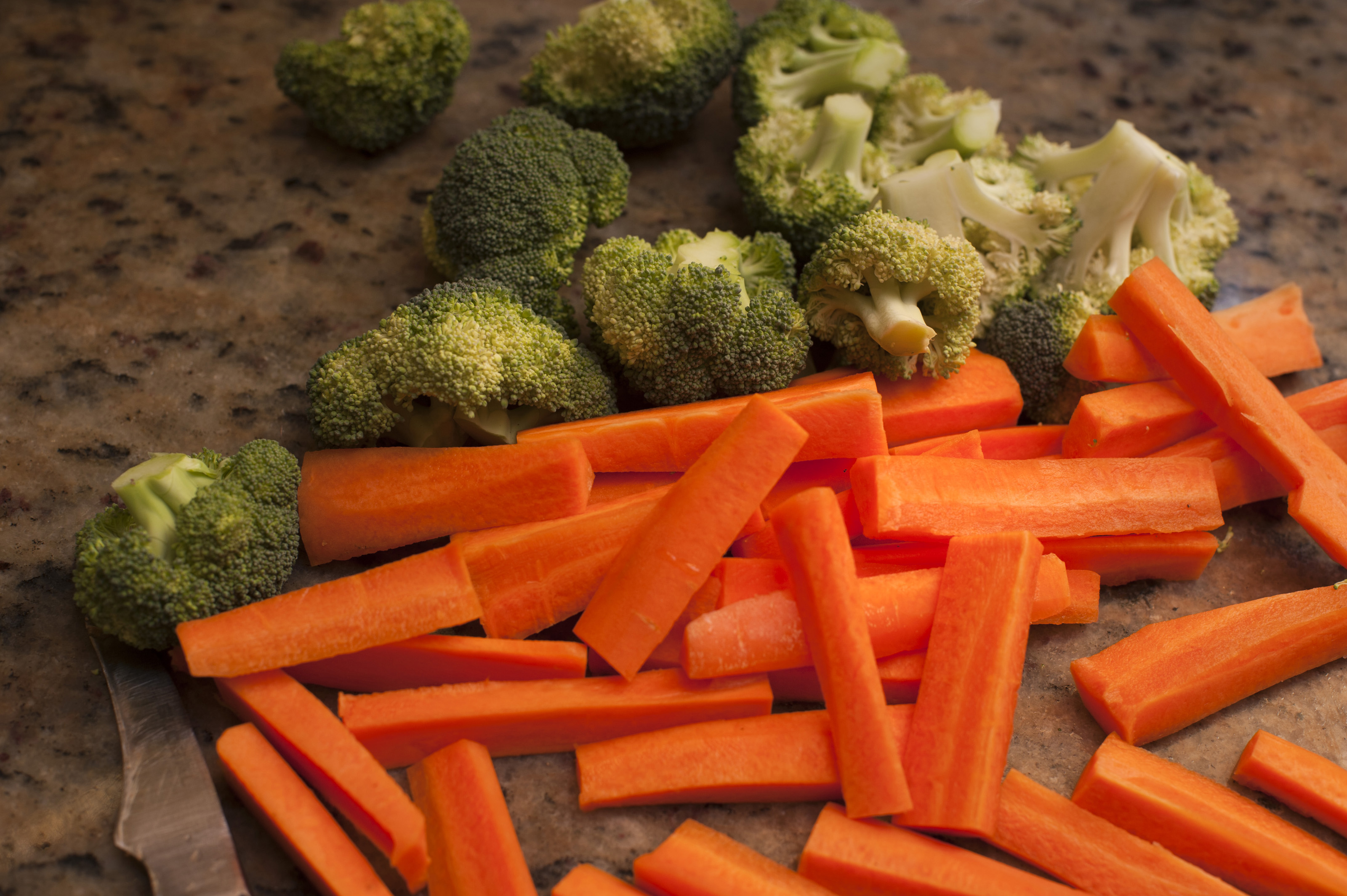 Chopped vegetables on a kitchen counter including carrot batons and broccoli pieces ready to be cooked as accompaniments to a meal