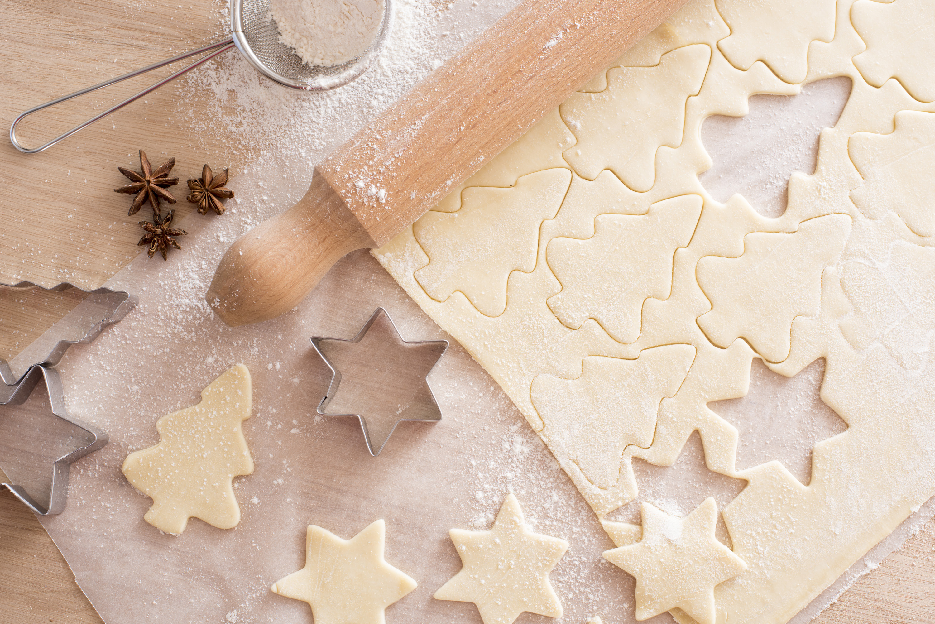 Keywords: dough, christmas, cookies, food, flour, cookie, bakery, preparation, xmas, homemade, gingerbread, star, fir, pastry, cutter, traditional, sweet, holiday, shape, background, dessert, wooden, baking, decoration, cooking, snack, tree, bake, season, biscuit, celebration