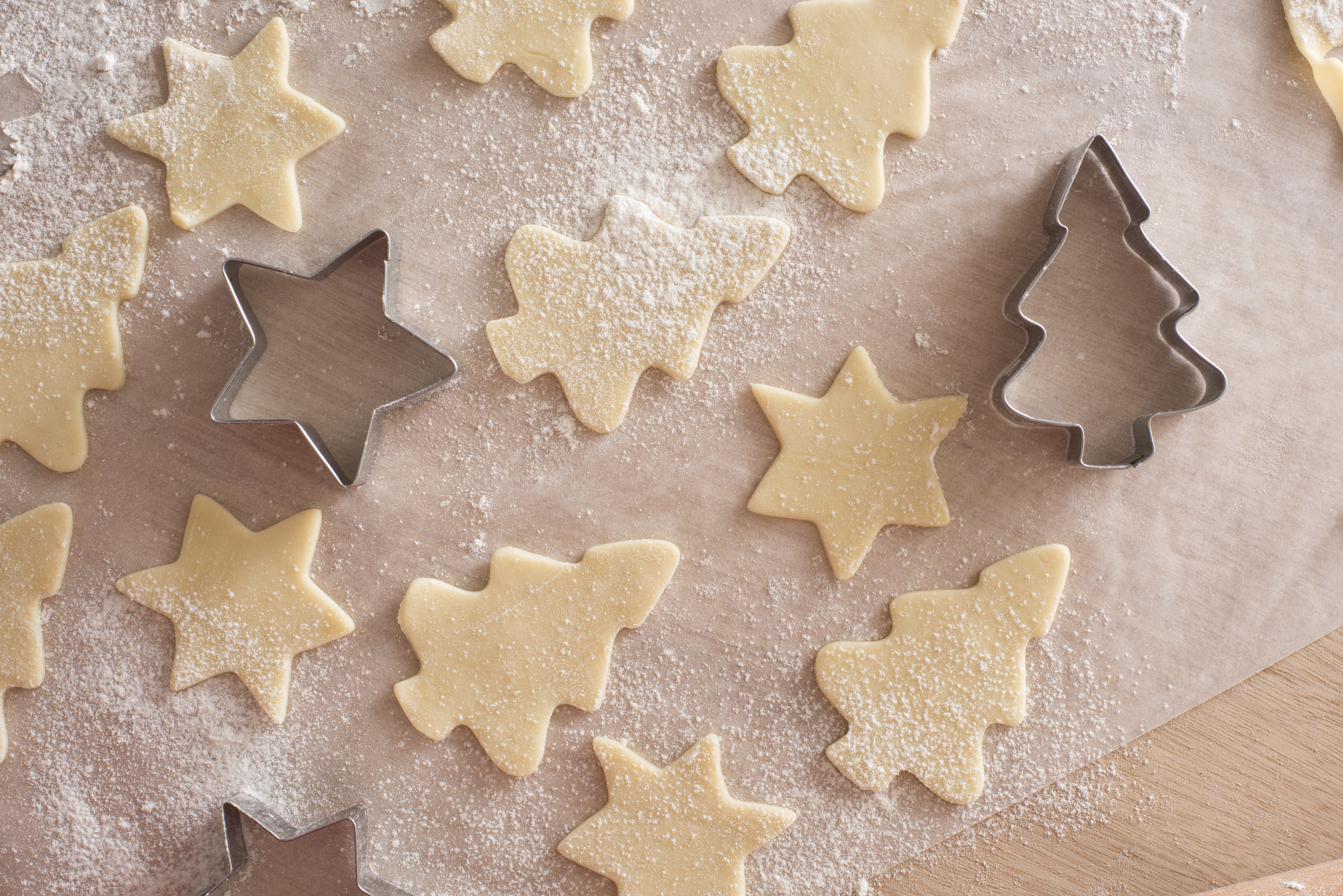 Making Christmas cookies with star and tree shaped cookie cutters in an overhead view of uncooked pastry shapes on oven paper