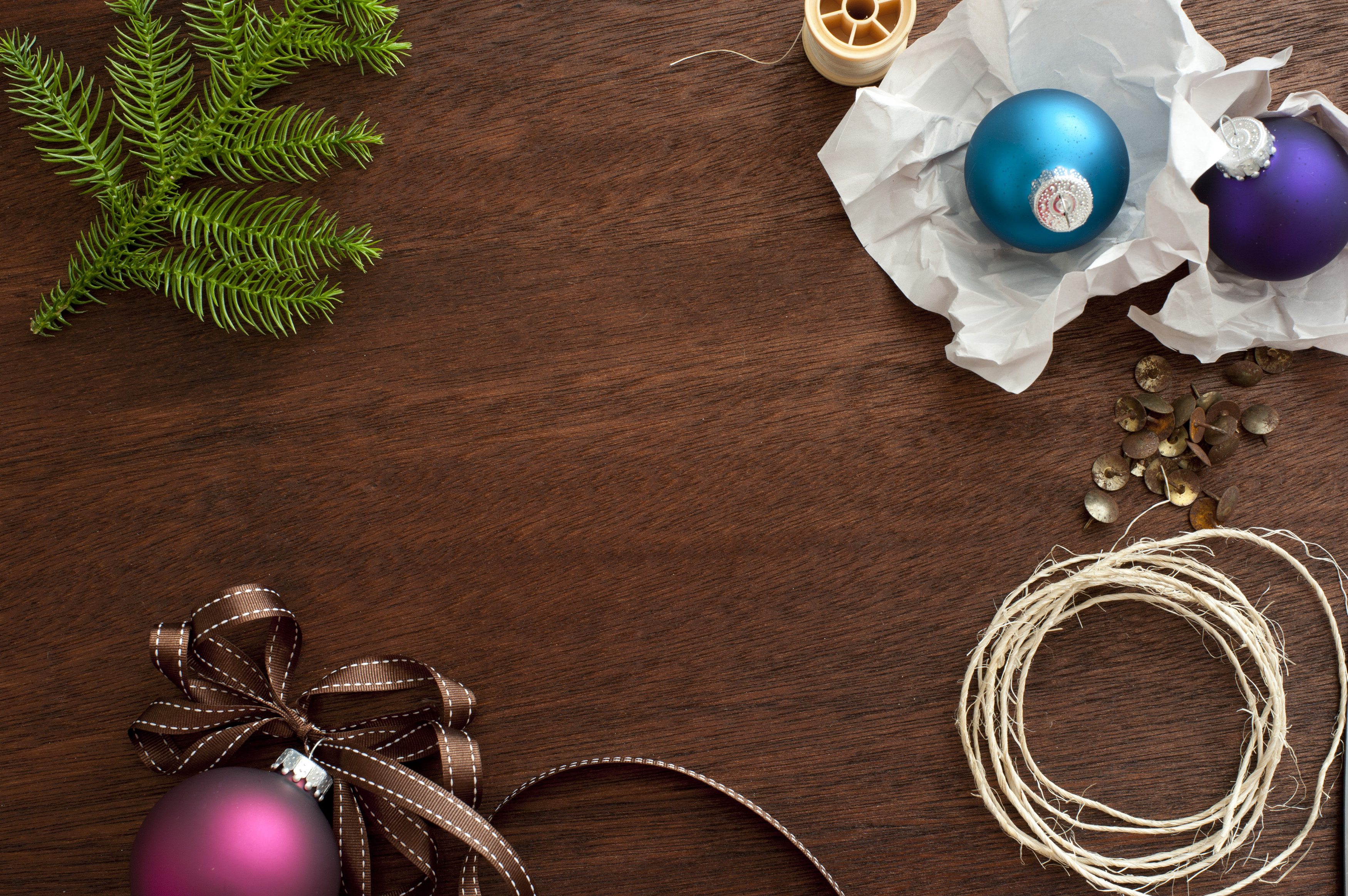 Keywords: celebration, christmas, decoration, hero, holiday, seasonal, xmas, bauble, ball, branch, copyspace, pine, preparation, twine, wood, decorating