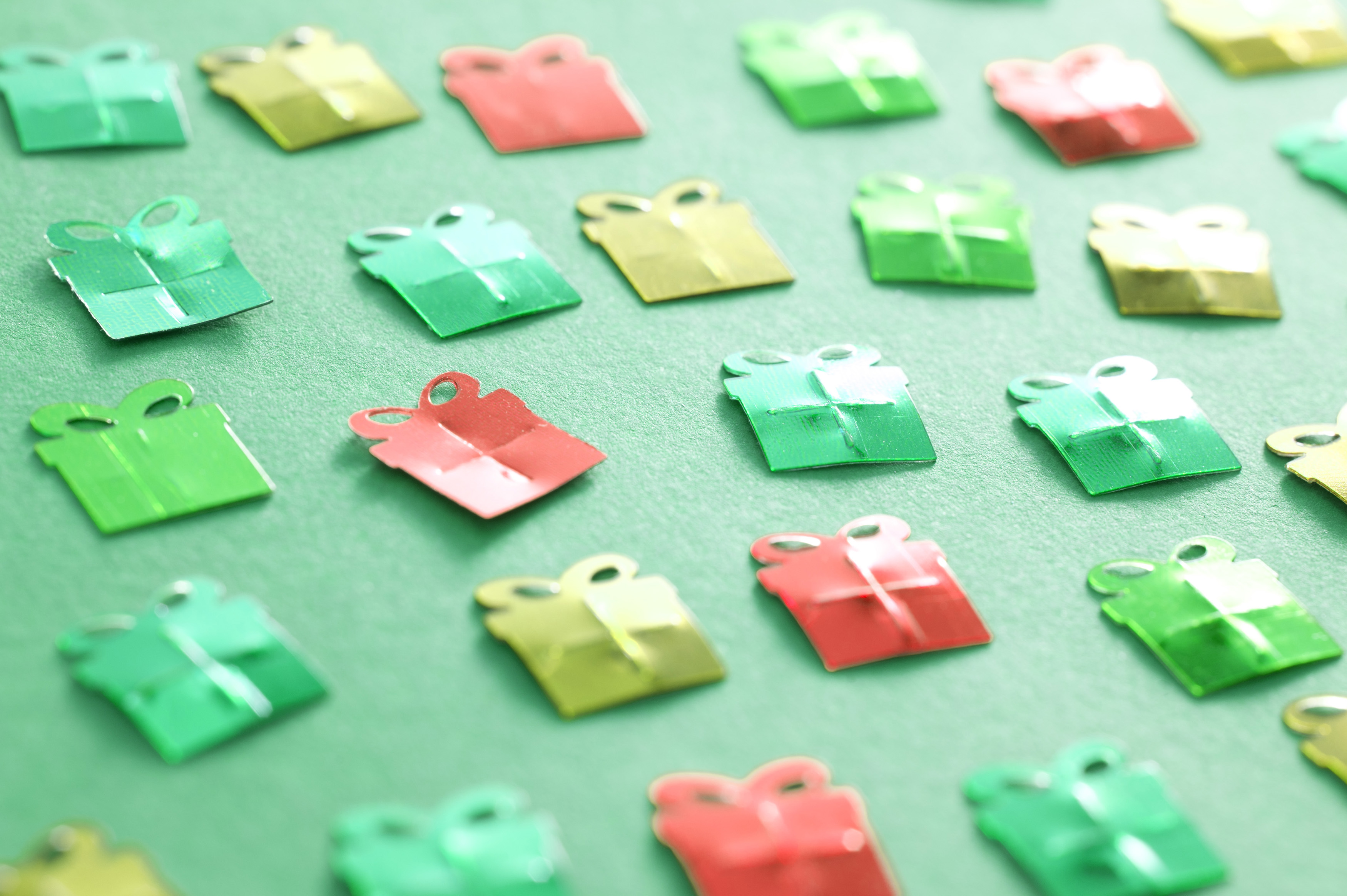 Keywords: background, christmas, decorations, gift, presents, shapes, xmas, celebration, green, holiday, noel, party, colorful, scattered, card