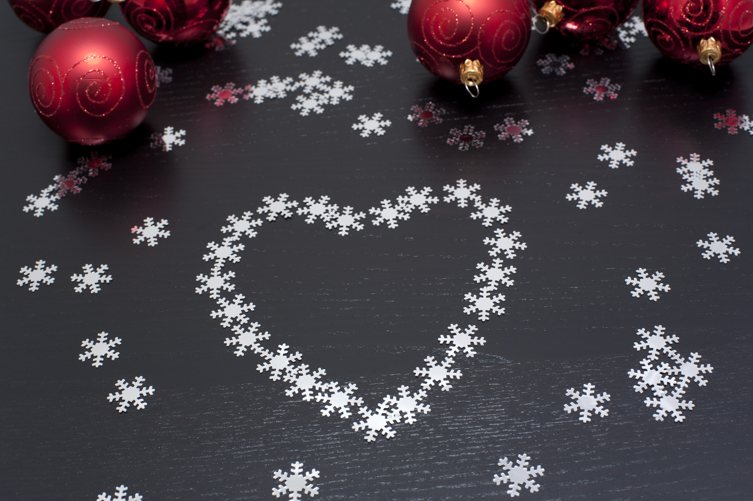 Christmas snowflake heart decoration on a dark background with colourful red bauble ornaments