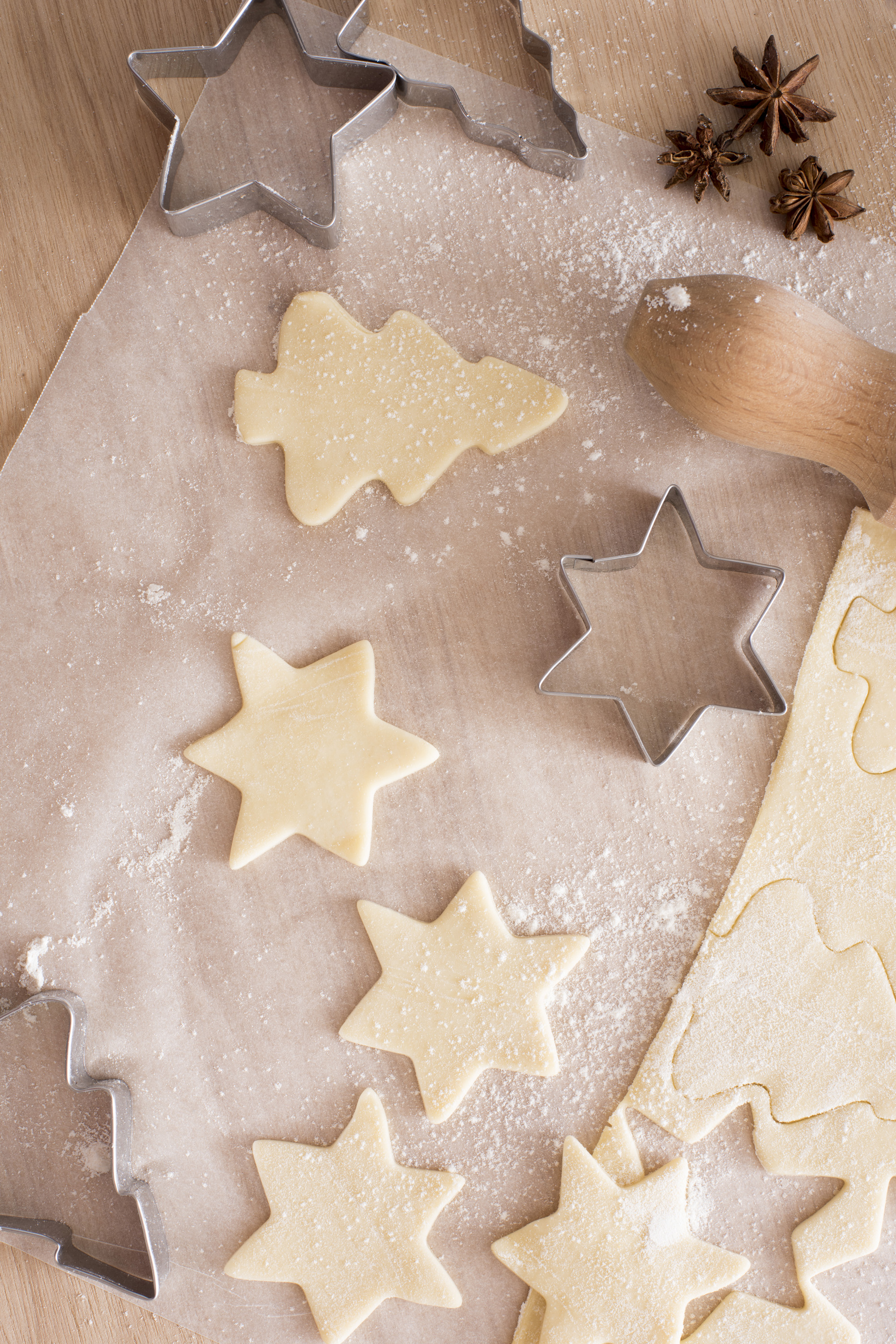 Baking traditional Christmas and seasonal biscuits with an overhead view on cutout raw pastry in star and tree shapes with dough and cookie cutters on a wooden kitchen table