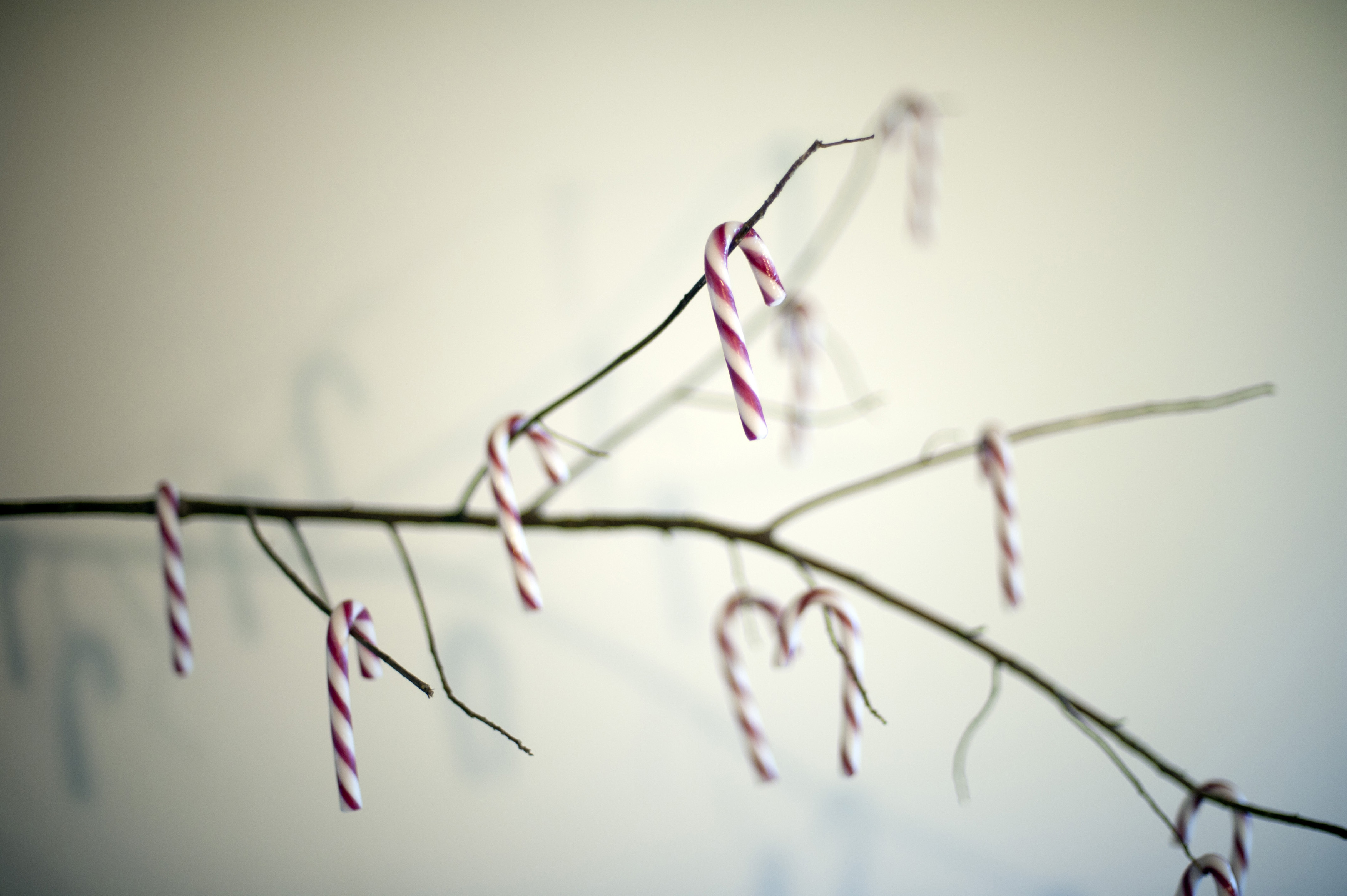 Keywords: branch, candy, canes, christmas, decoration, festive, hanging, indoors, selective focus, striped, treat, sweets, decorated, full frame, still life