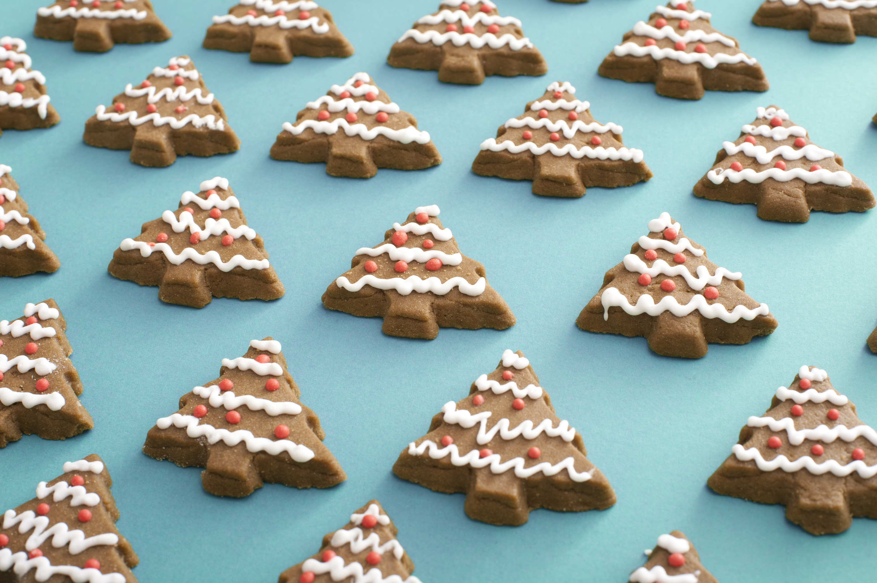 Iced gingerbread Christmas tree cookie background neatly laid out on a blue background in a high angle view
