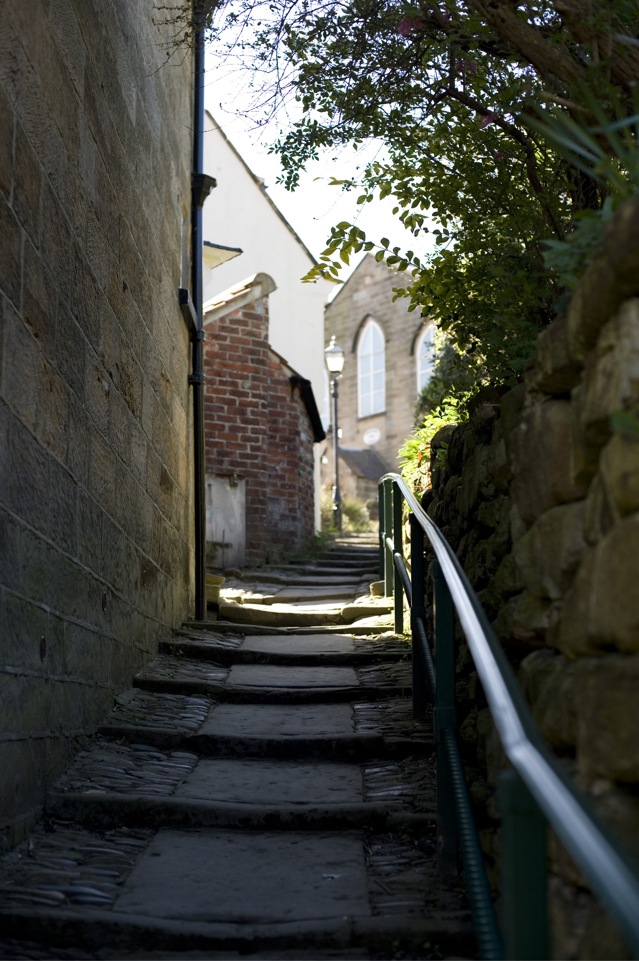 Keywords: metal, old, scene, walkway, village, steps, dreamy, twisted, ethereal, narrow depth of field, stairs, narrow, yorkshire, dreamlike, quaint, fishing village, handrail, robin hoods bay, hand rail