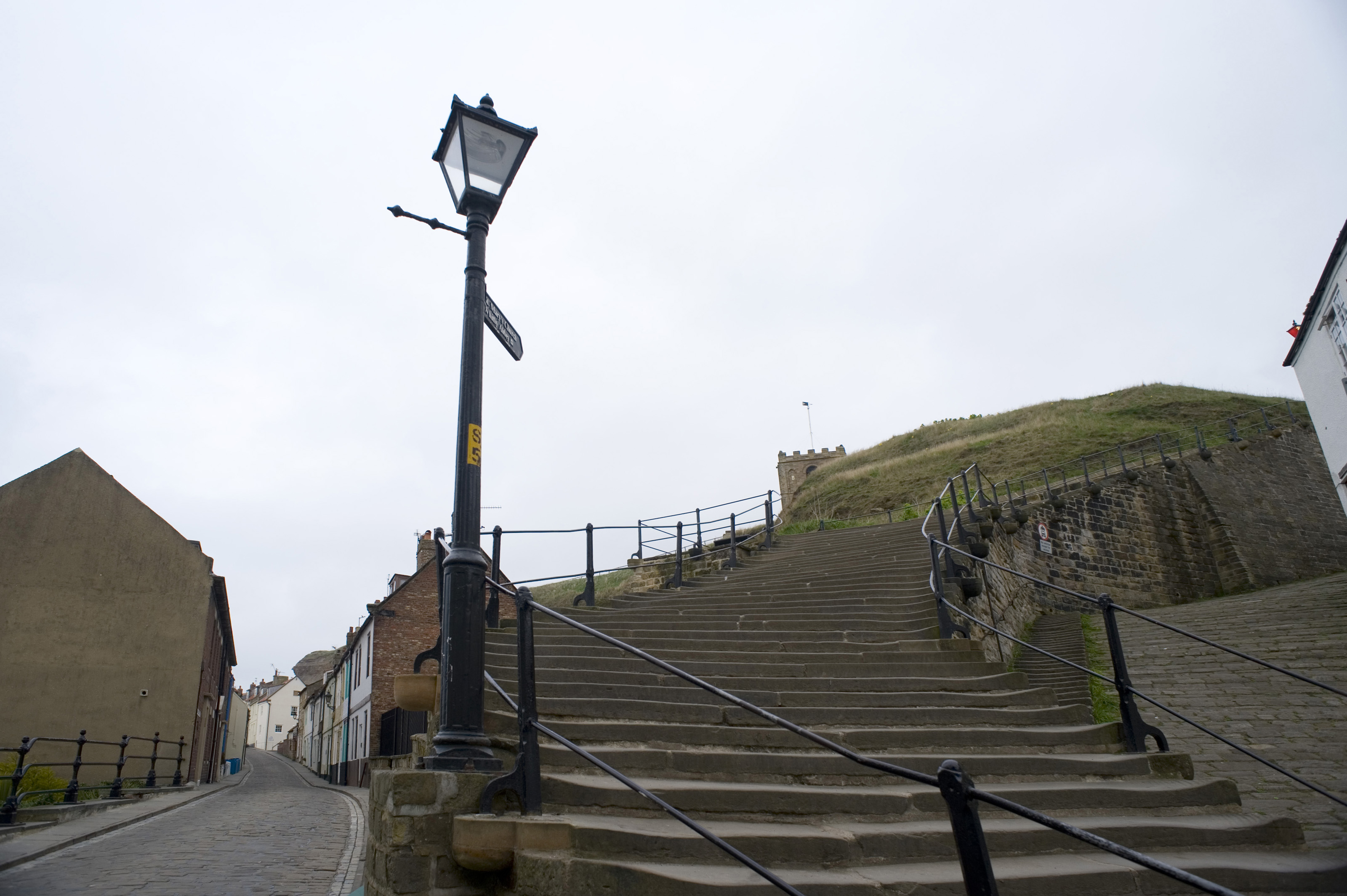 Keywords: empty, travel, stone, architecture, structure, town, historical, landmark, england, church, steps, climb, stairs, ascending, lamppost, whitby, north yorkshire, st marys church, tate hill, 199