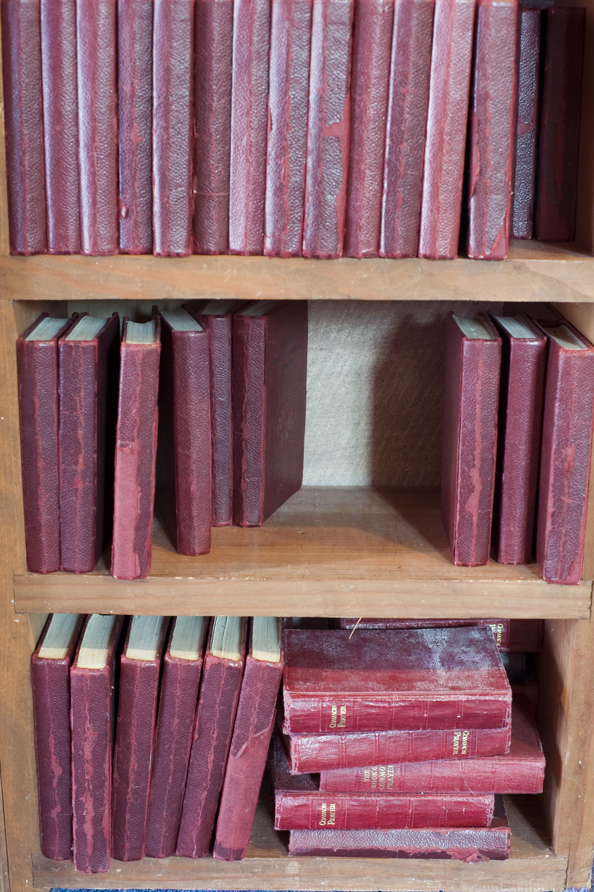 Keywords: leather bound, old, worn, tatty, used, books, bookshelf, stack, red, burgundy, wood, wooden