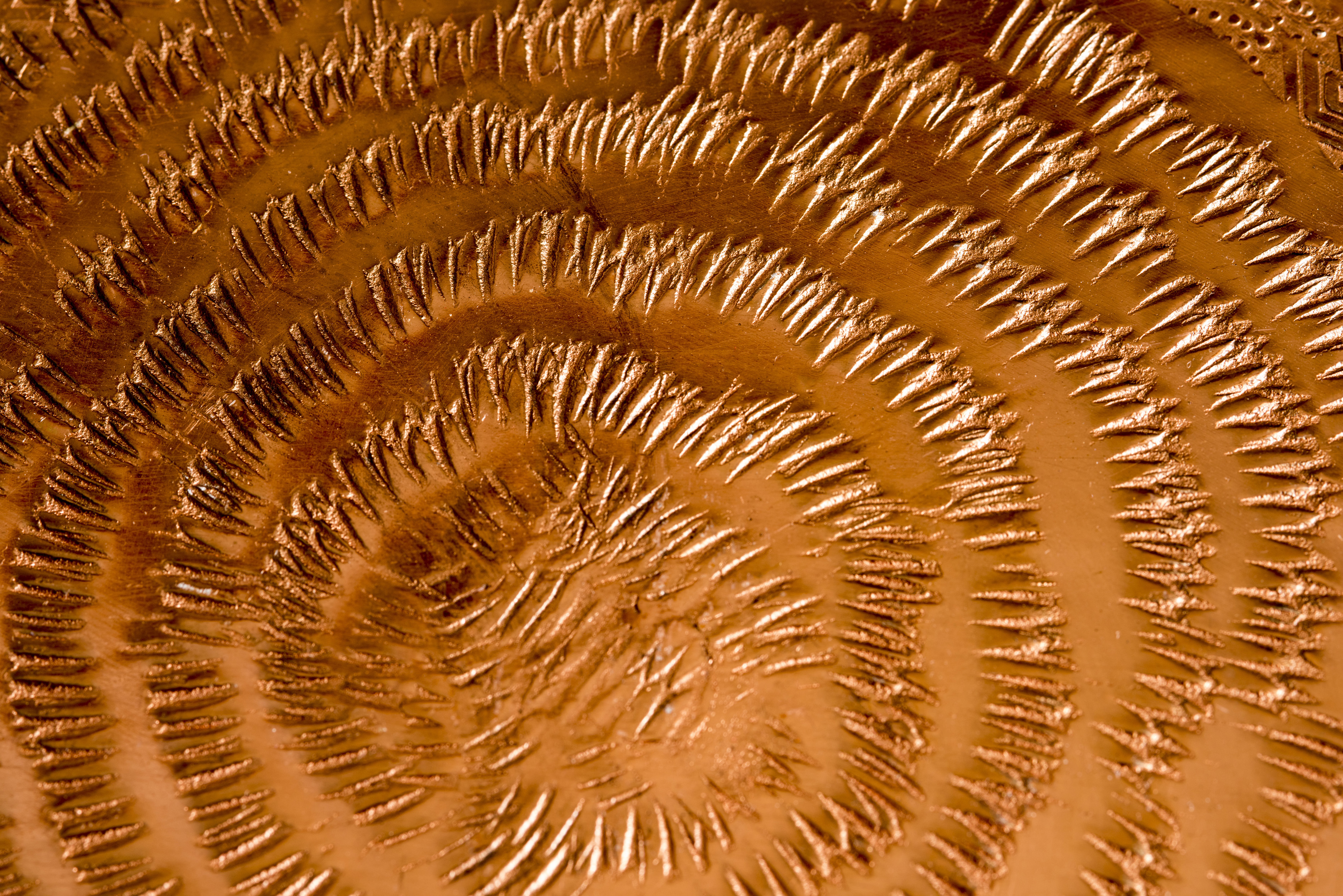 Keywords: background, full frame, texture, copper, metal, decorative, pattern, beaten, circular, concentric, decoration, handicraft, backdrop, indented, surface