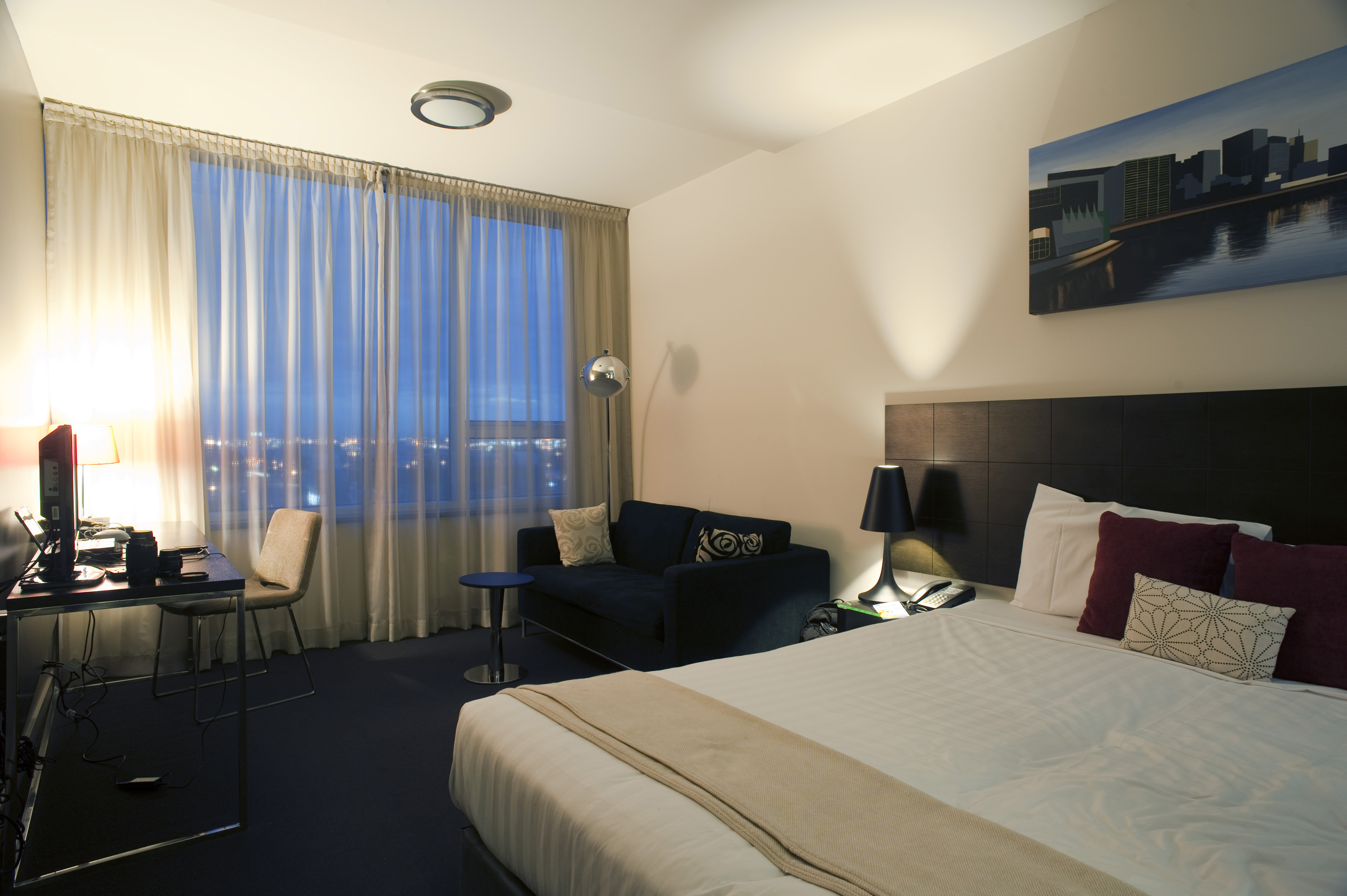 Keywords: bed, bedroom, accommodation, city, desk, double, hospitality, hotel, lights, travel, view, window, decor, interior, tourism, twilight, city