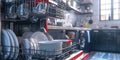 Inside of a dishwasher stacked with clean plates, bowls and mugs at the end of a washing cycle in a health and hygiene concept
