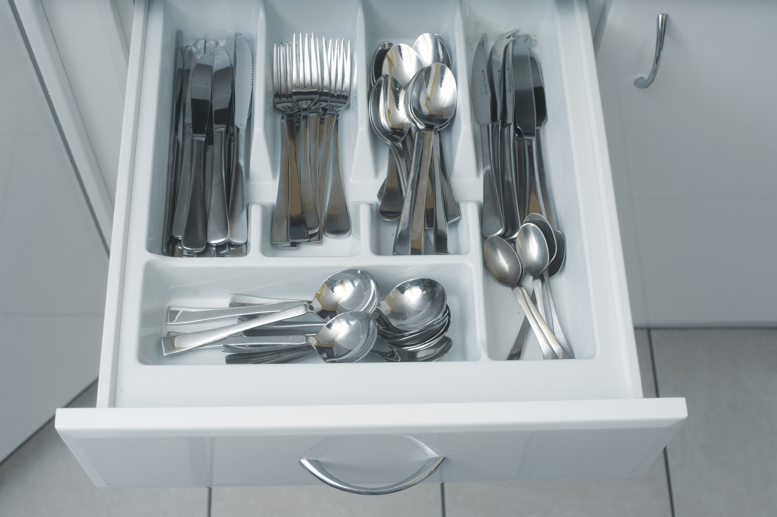 Keywords: kitchen, cutlery, utensils, fork, knife, spoon, drawer, white, clean, new, modern, concept, compartments, compartmentalised, sorted, array, separate, compartmentalisation