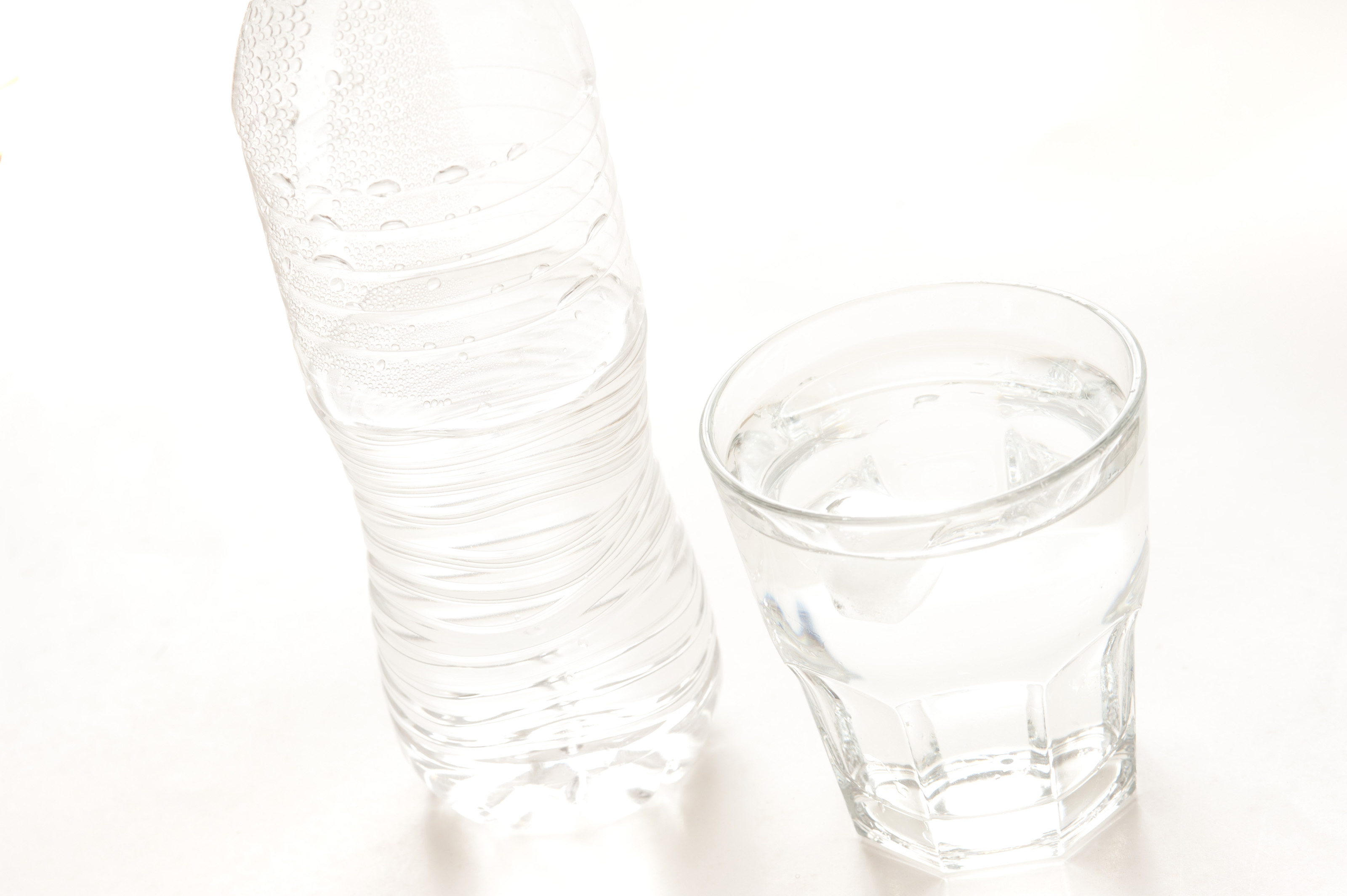 Glass of fresh clean water standing alongside a plastic water bottle on a white background