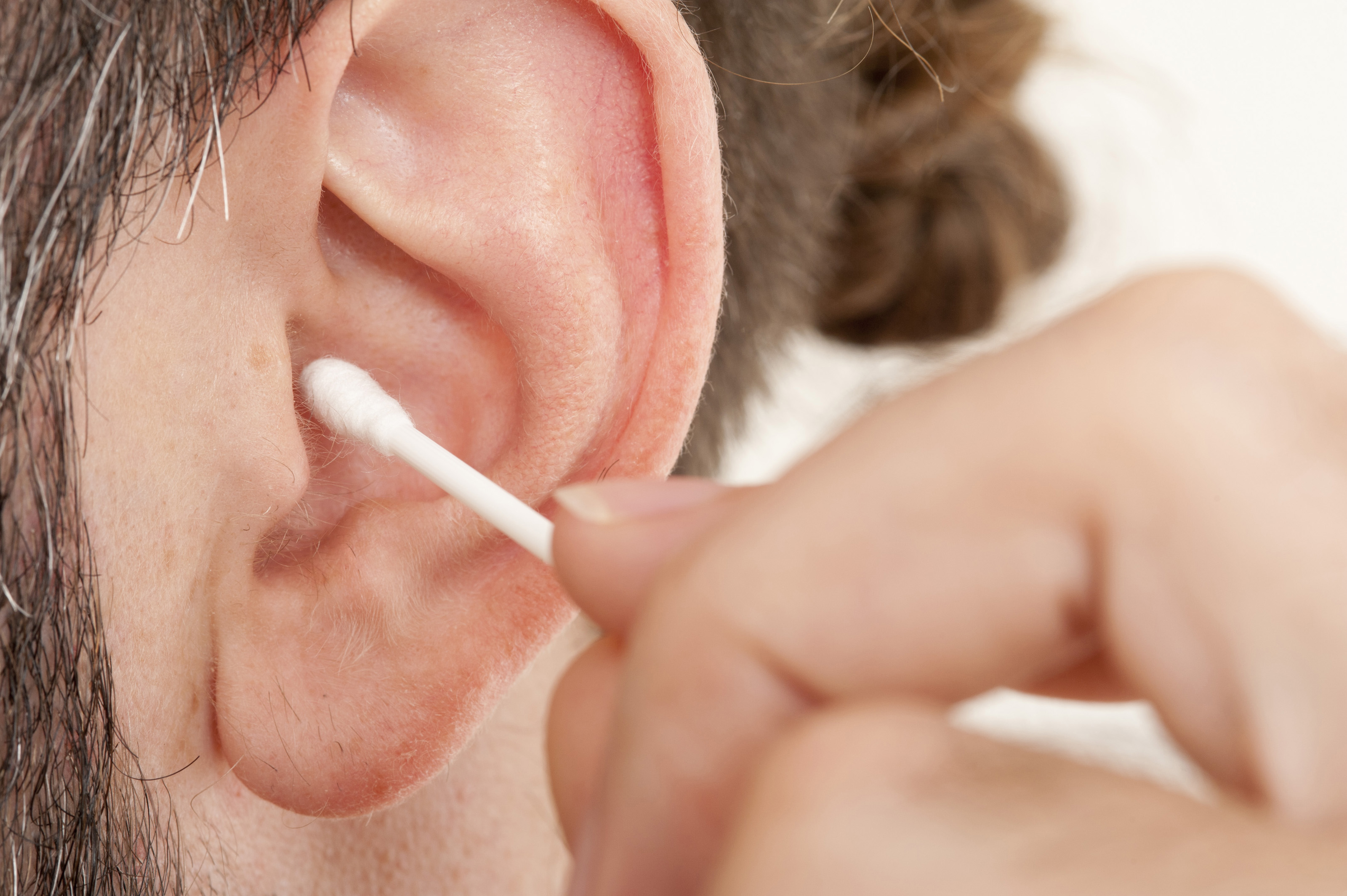 Person cleaning wax out of their ear using a clean cotton bud in a personal hygiene and health concept
