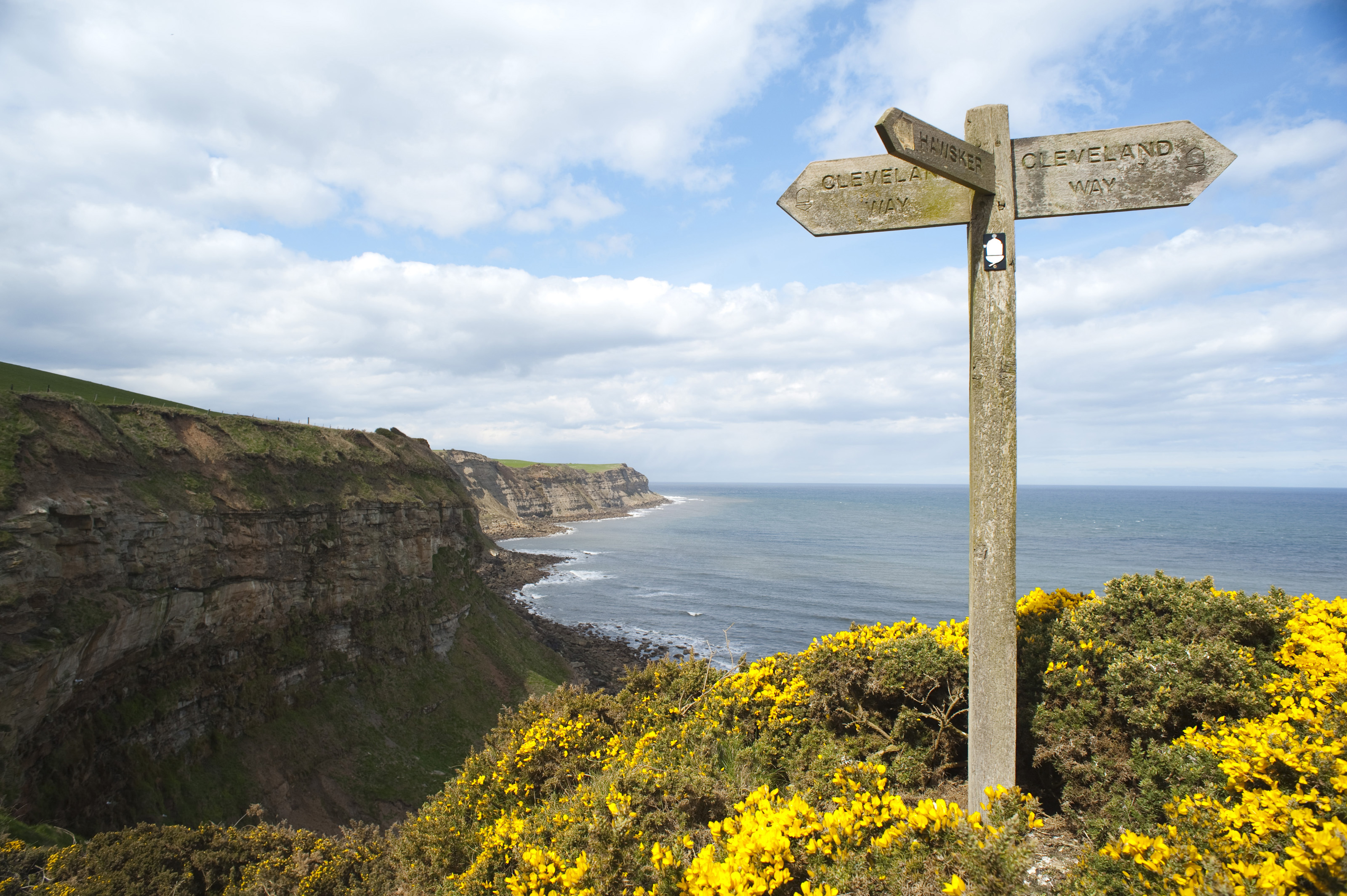 Keywords: cleveland way, direction, coastline, walkway, signpost, cliffs, footpath, arrows, gorse, wooden, nature, countryside, hike, ramble, marine, yorkshire, coast, yellow, flowers, topography