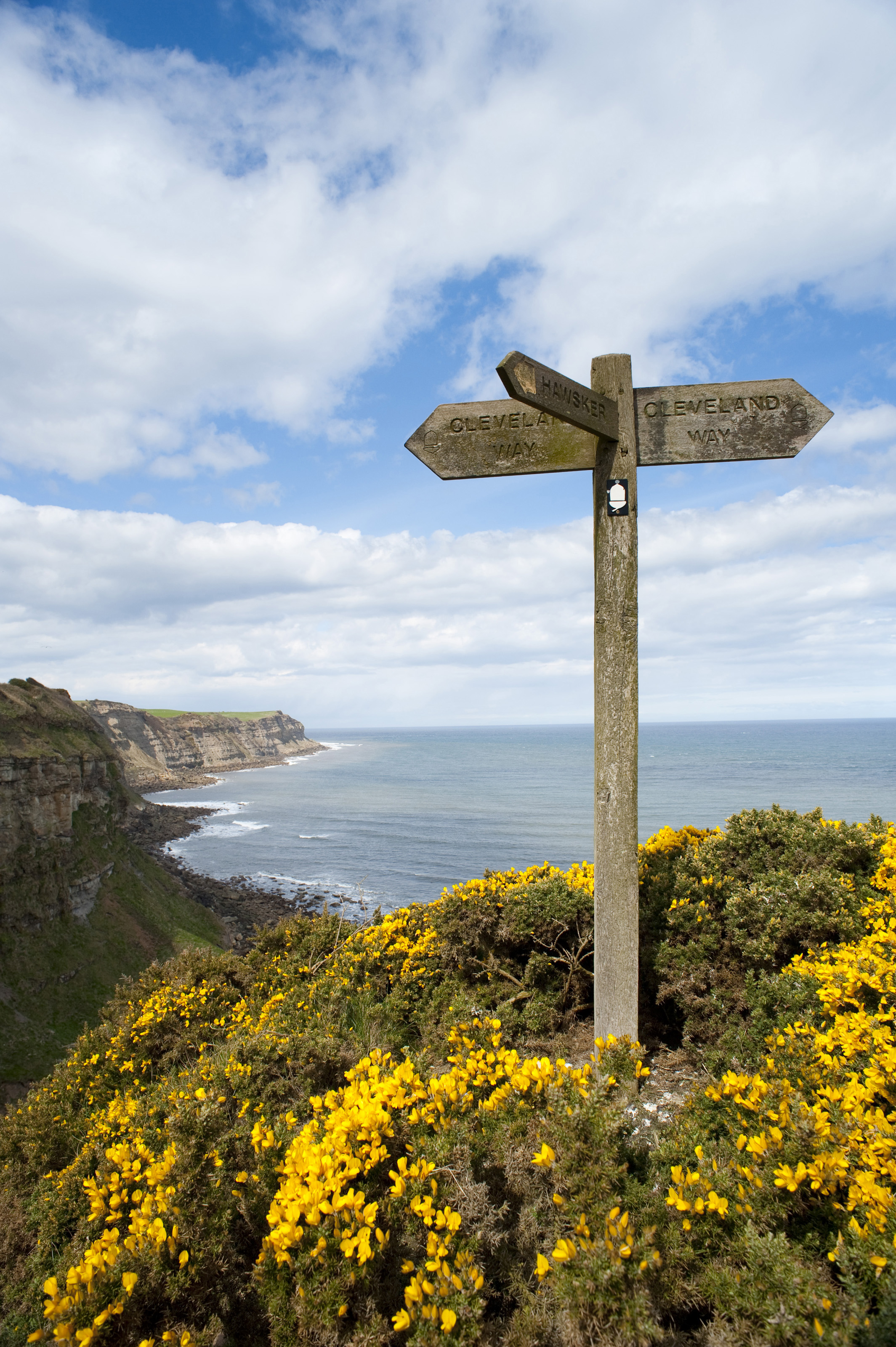 Keywords: wooden, signage, nature, summer, countryside, rural, scenery, pointing, walking, scenic, coastal, shoreline, coastline, trail, england, english, signpost, cloudscape, hiking, points, directional, heather, gorse, cleveland way, yorkshire coast