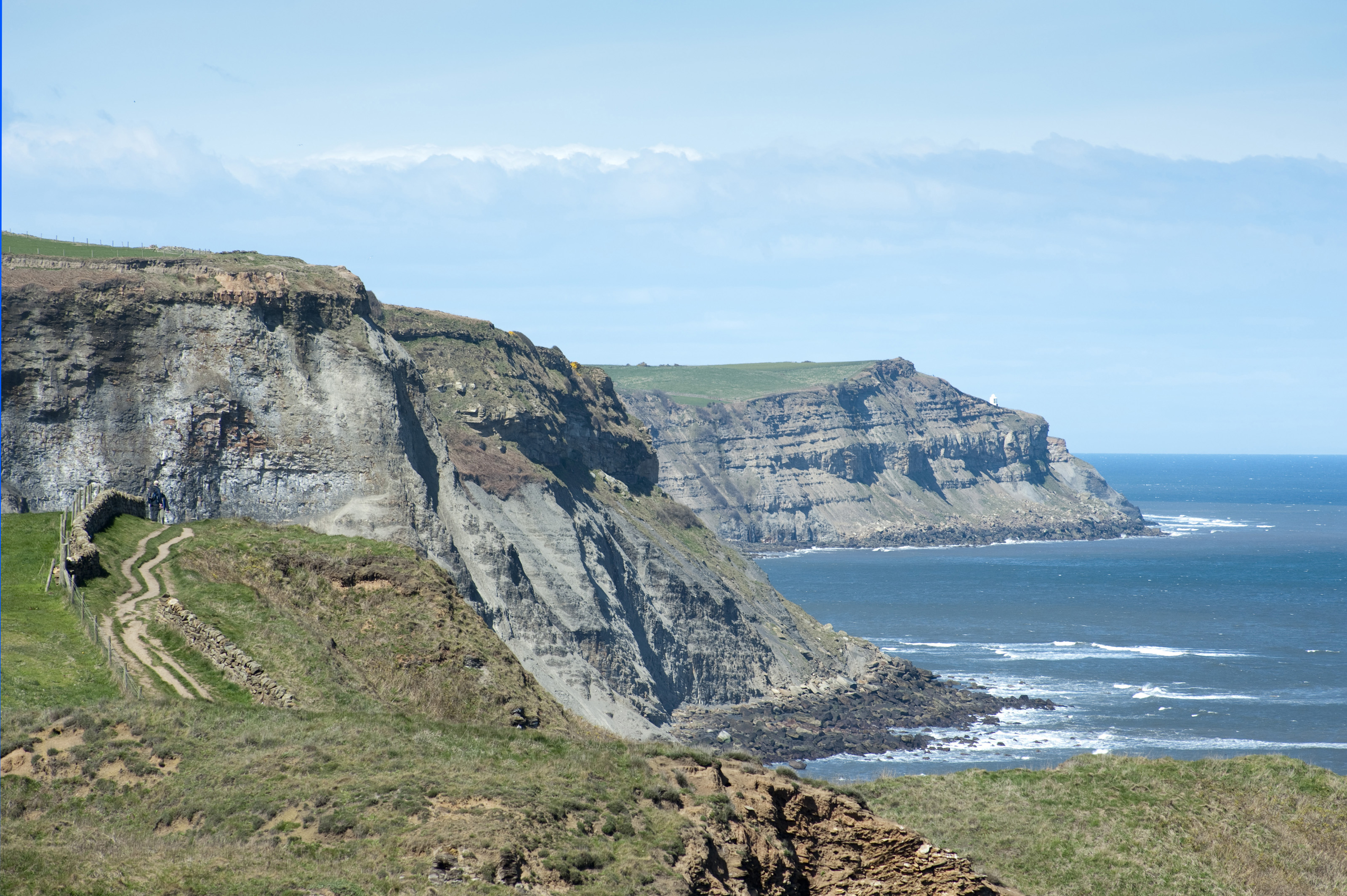 View of coastal cliffs with the Cleveland Way, a footpath running along the North Yorkshire coastline