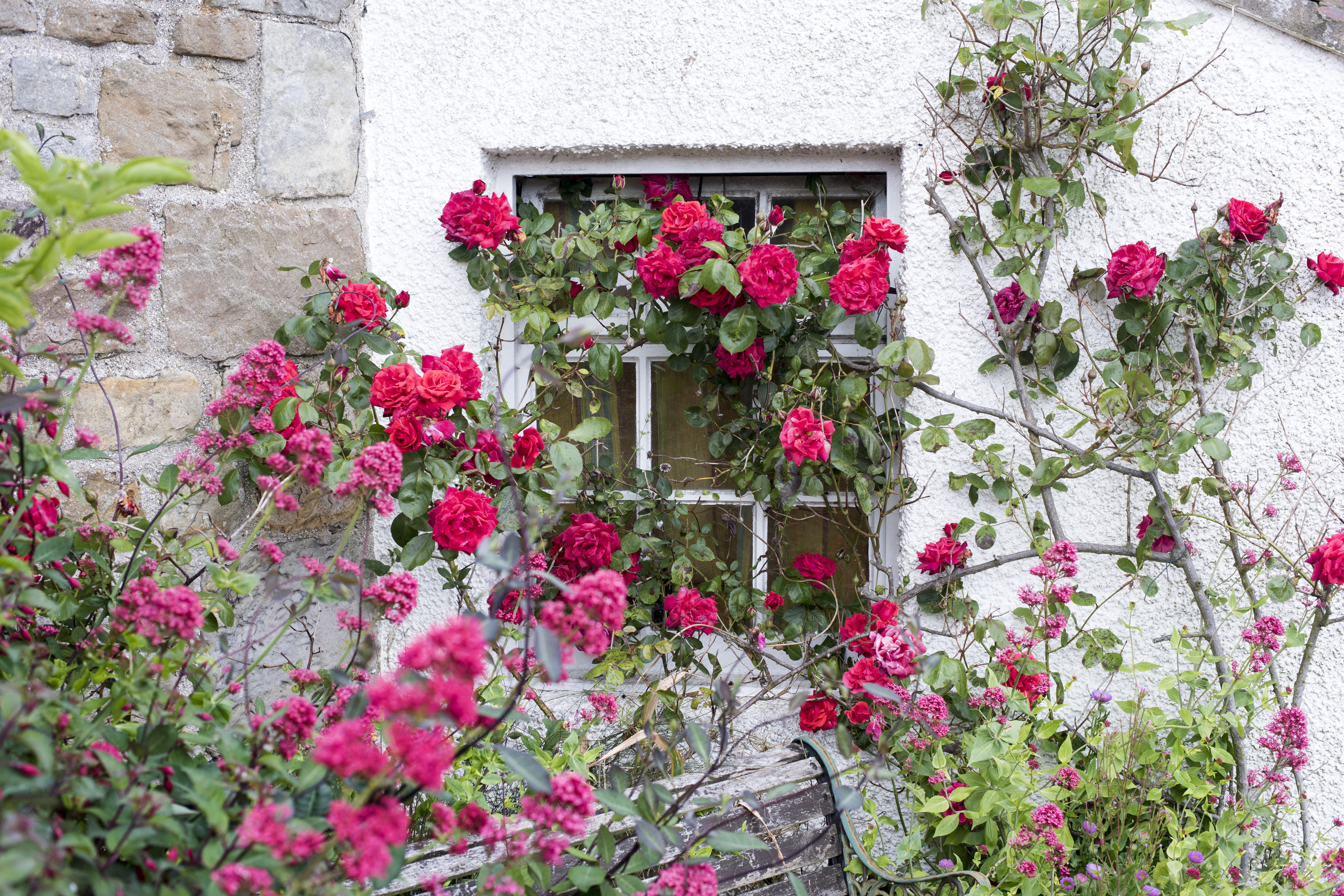 Keywords: blooming, blossoming, climbing, cottage, flowers, home, house, nature, plants, pretty, quaint, red, roses, rustic, wall