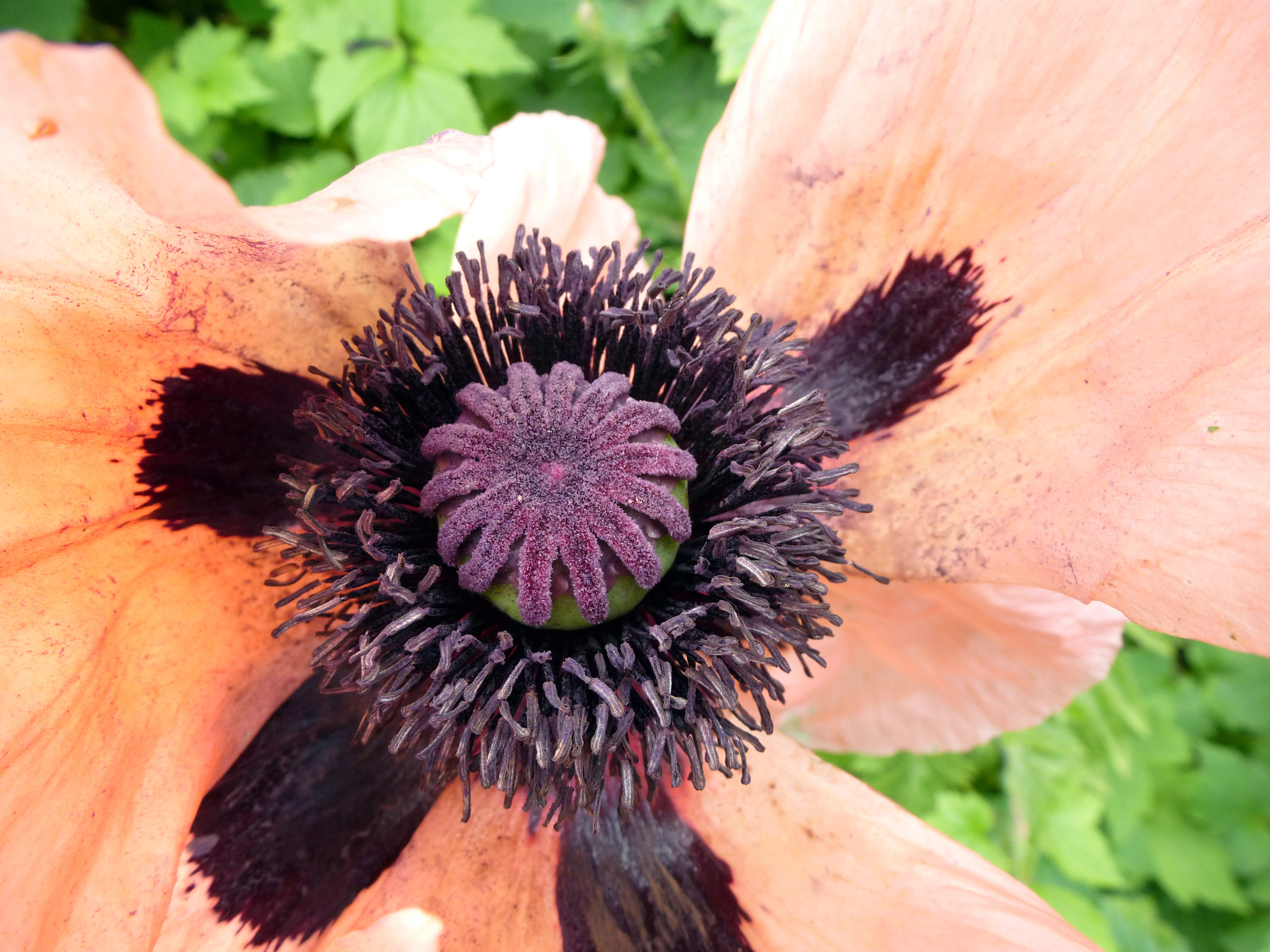 Extreme Macro Close Up of Unusual Center of Poppy with Faded Wilting Petals as seen from Above in Outdoor Summer Garden with Green Leaves in Background
