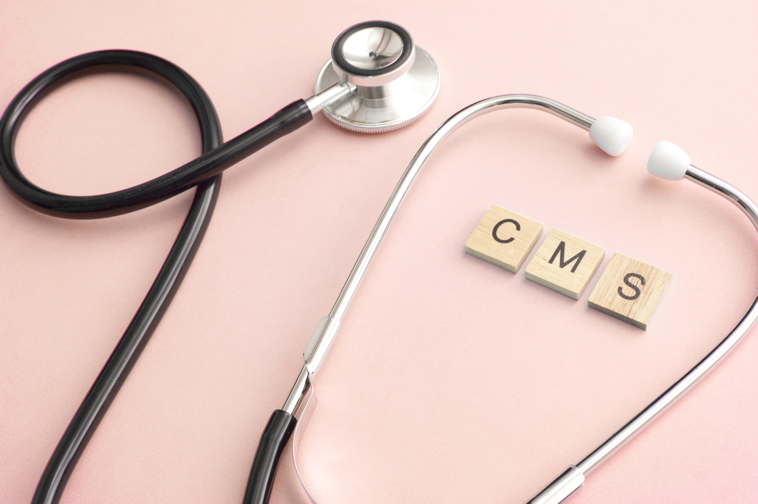 Content Management System expert or diagnosis concept with medical stethoscope surrounding three little block letters over pink background