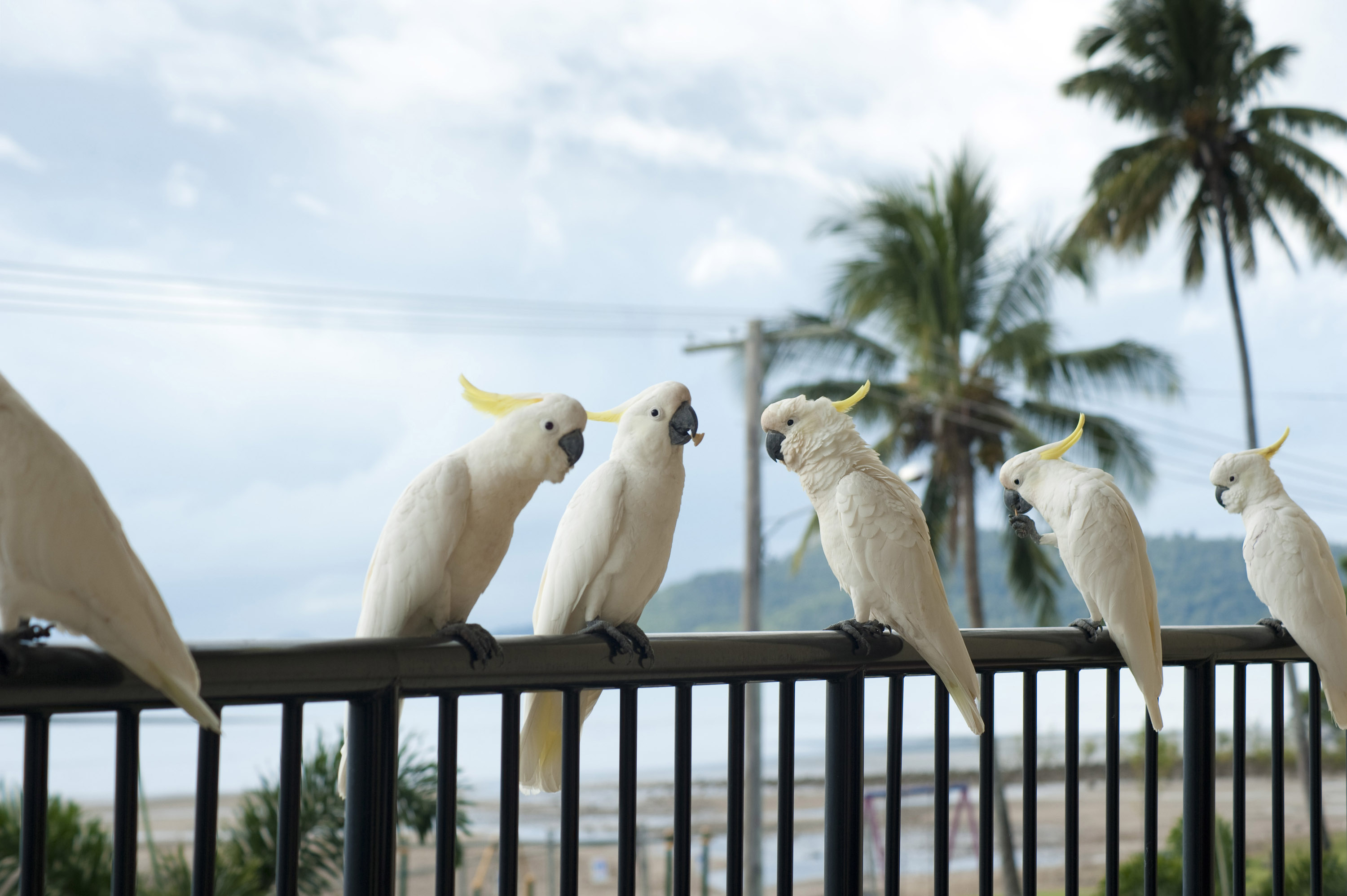 a line of sulphur crested cockatoos, sitting on a balcony handrail