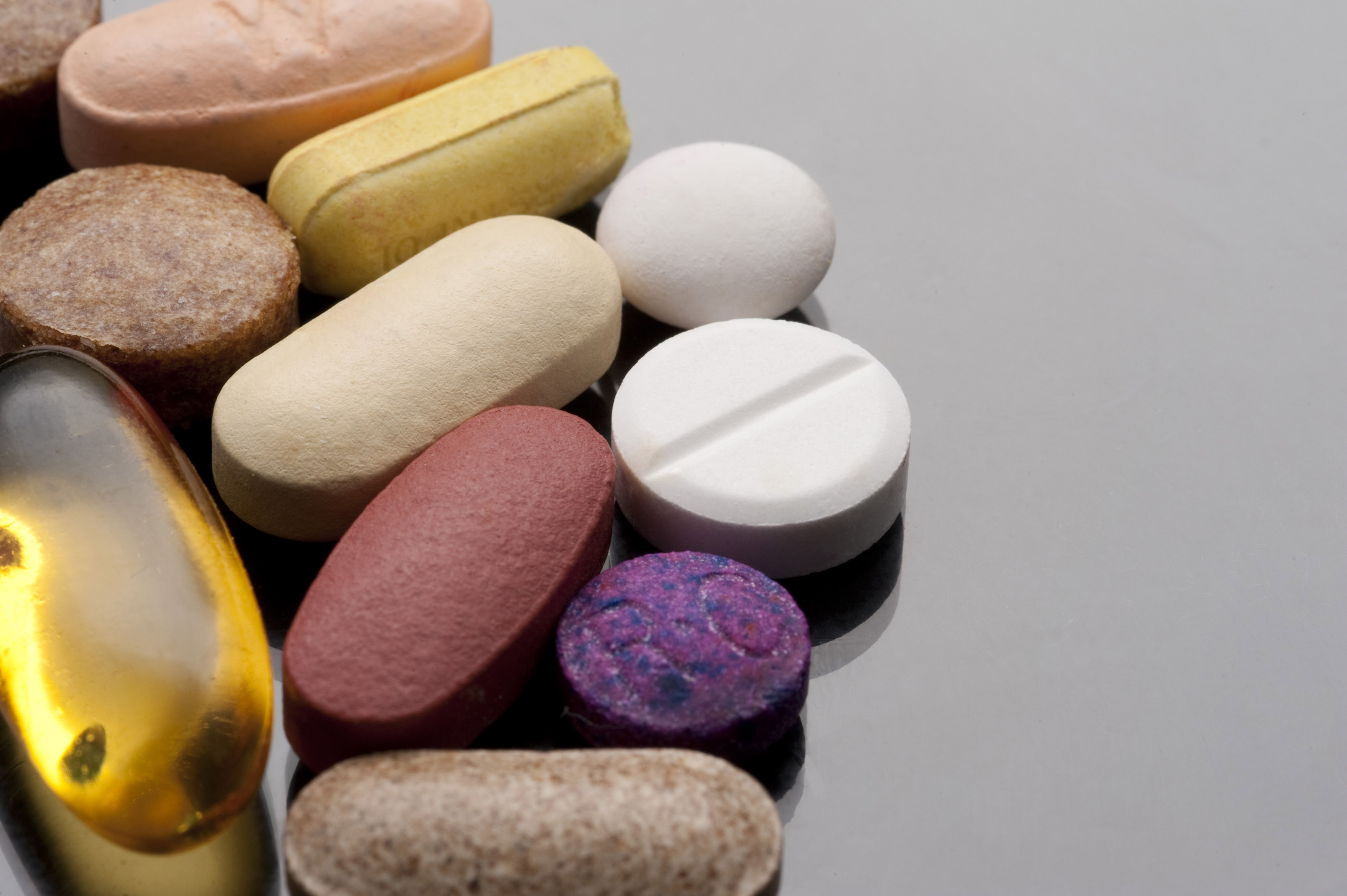 an assortment of drugs laid of a reflective surface