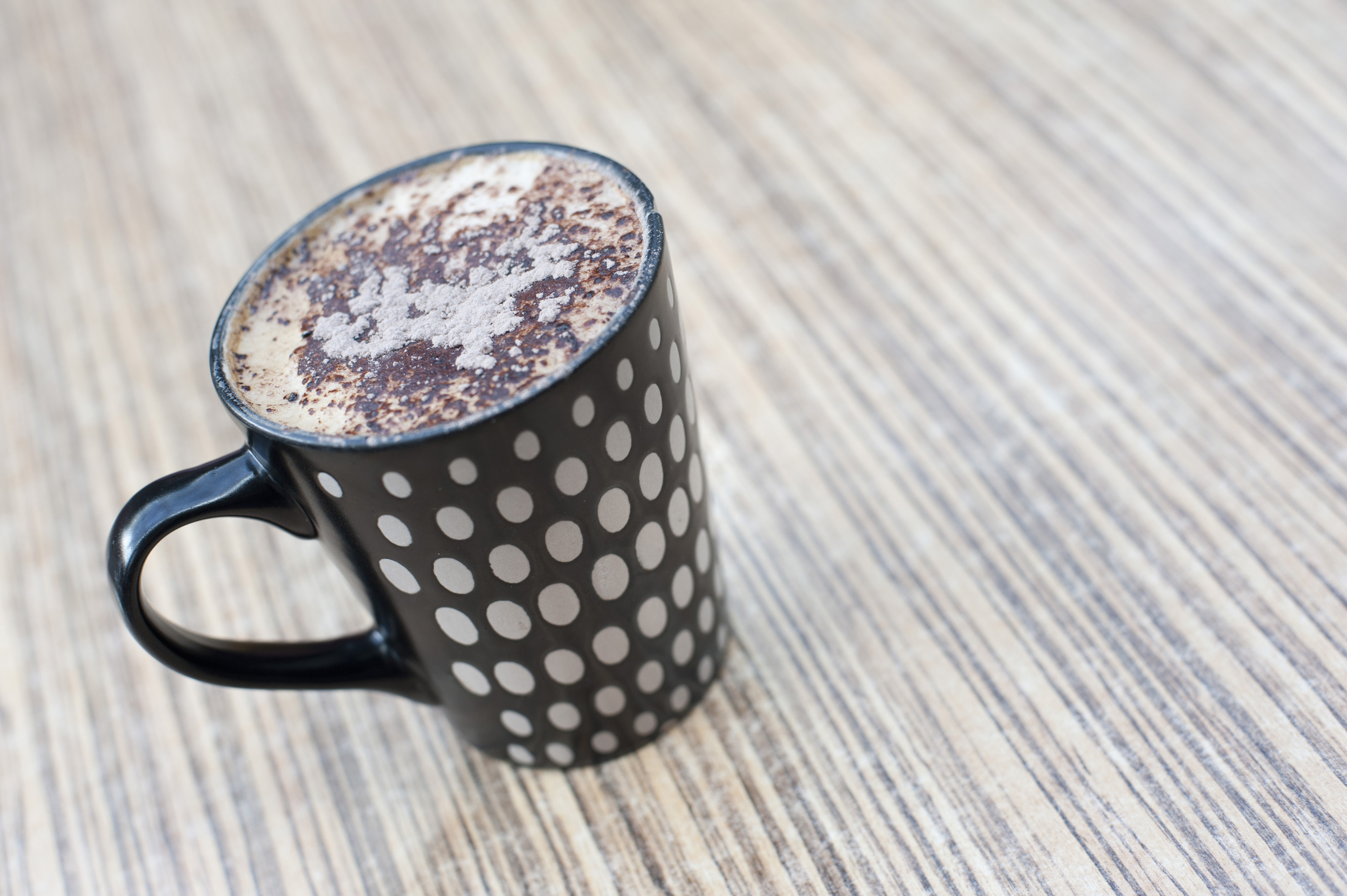 Keywords: cup, coffee, wooden, table, black, polka dots, full, espresso, drink, refreshment, close up, mug, copy space, beverage, caffeine, chocolate